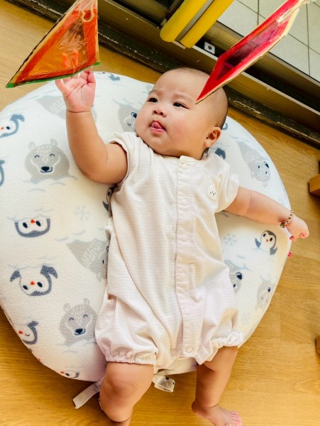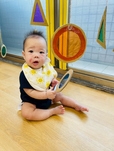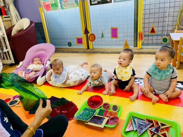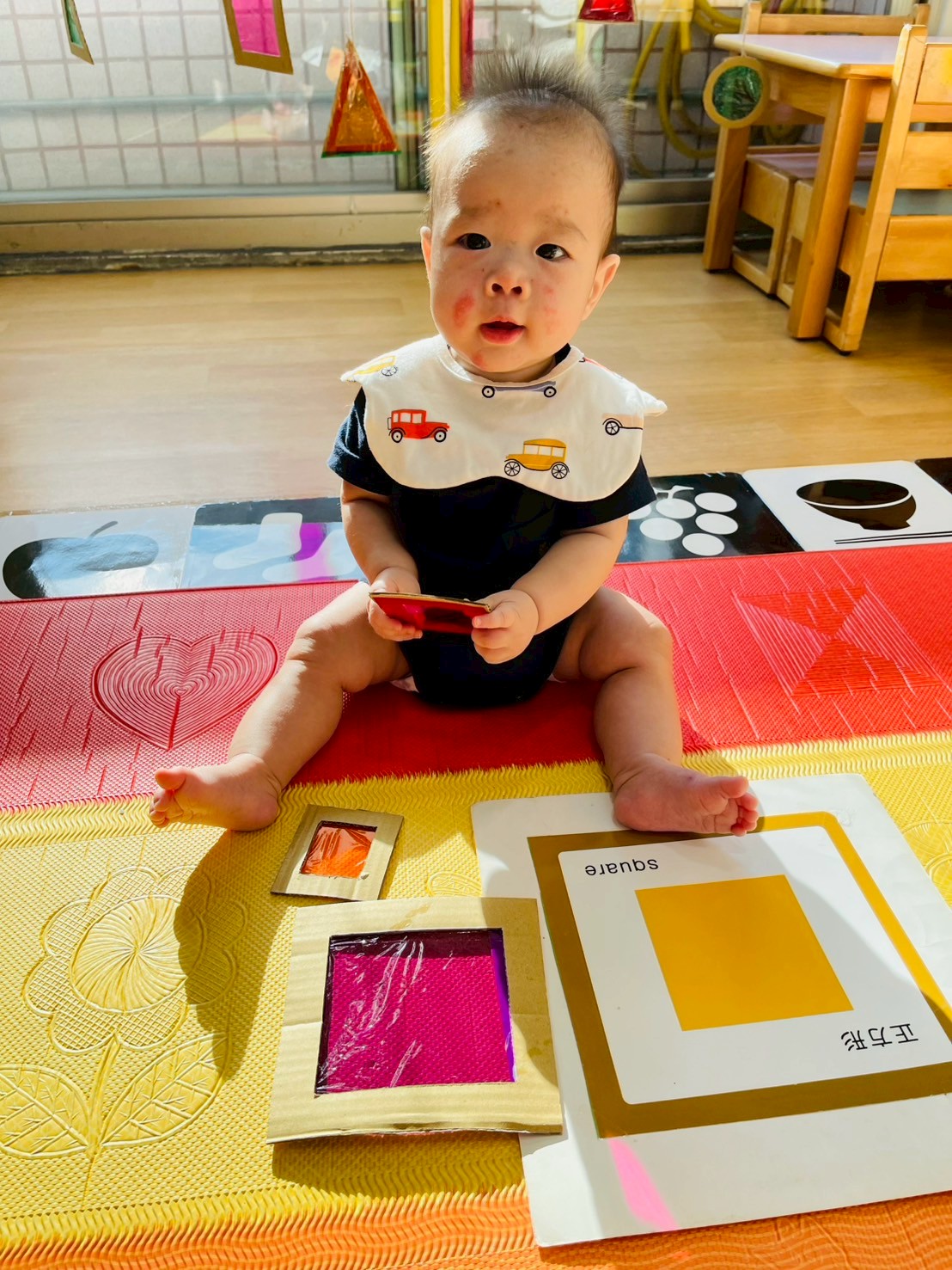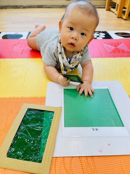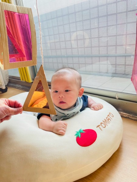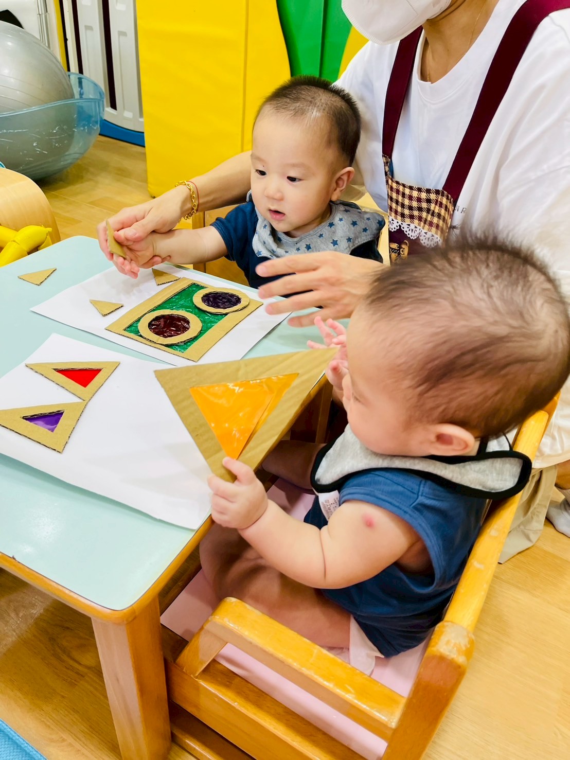本週課程「彩窗積木」,藉由玻璃紙做出的彩窗積木,讓孩子們透過觸覺與視覺來探索不同顏色.形狀.大小,並利用太陽光照射彩窗積木透出光影給孩子追視與觸摸喔!而在美勞作品使用不同大小彩窗積木,給孩子黏貼出屬於自己的作品