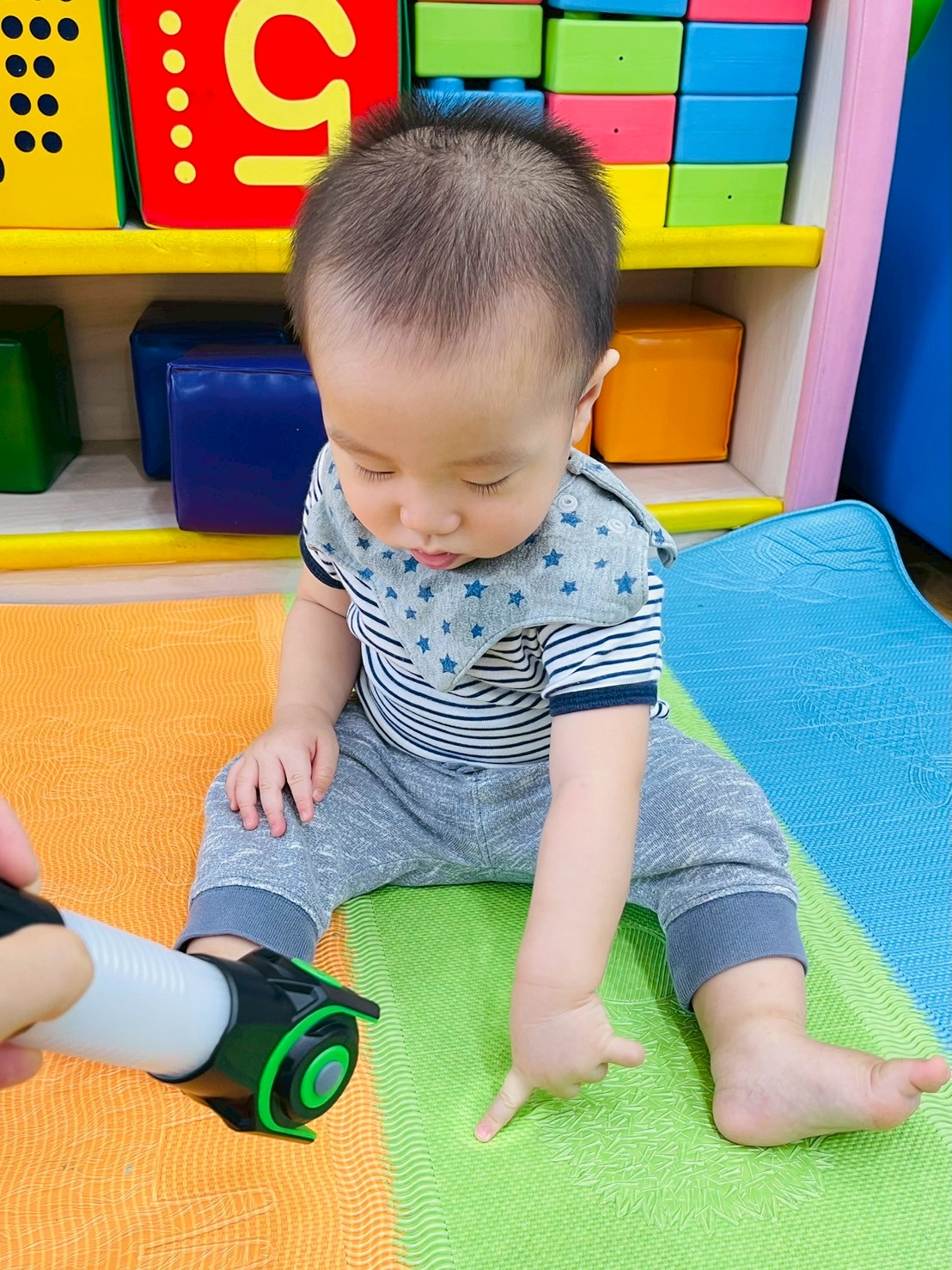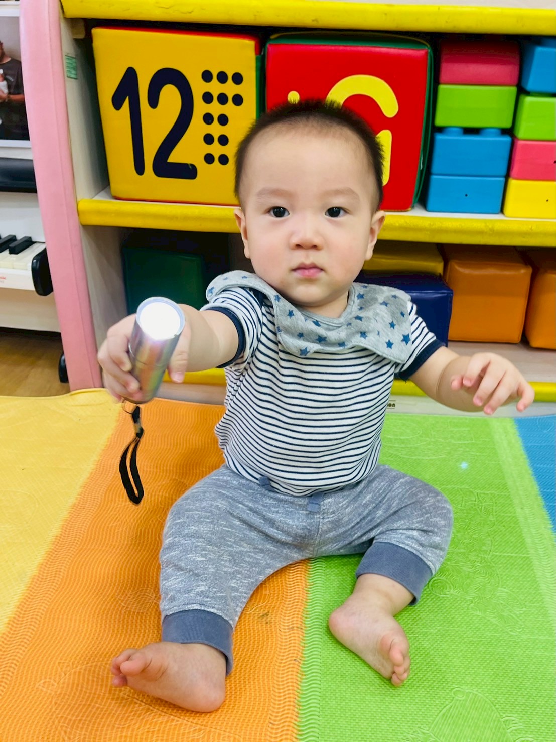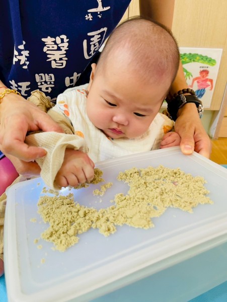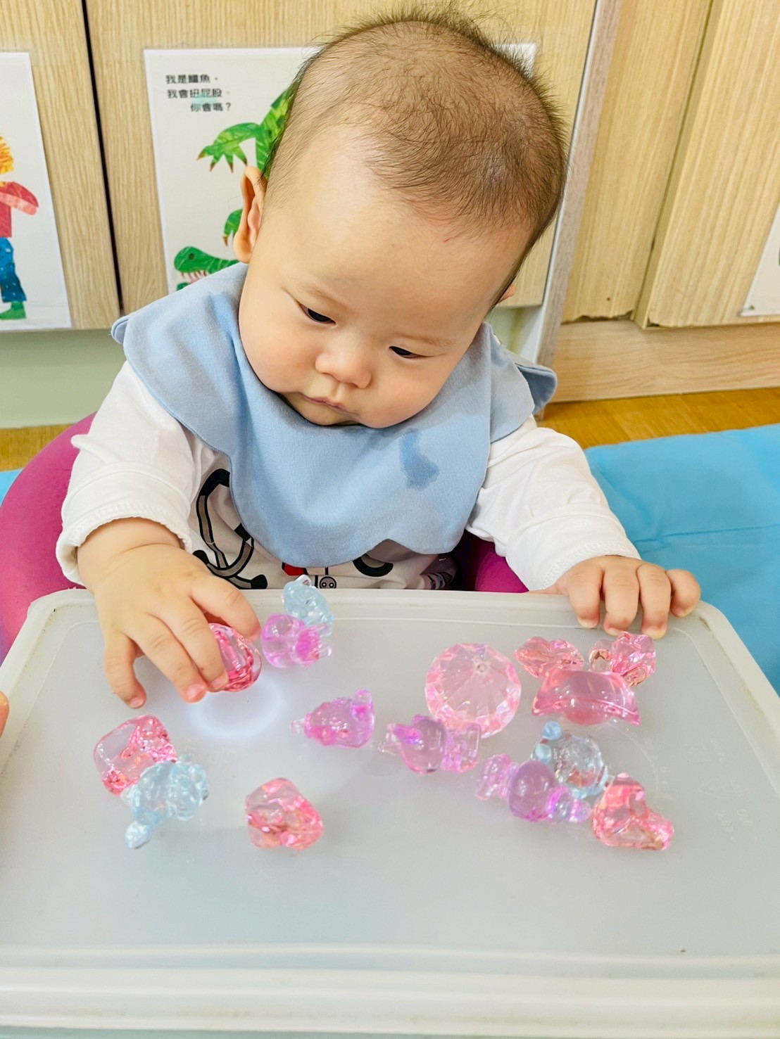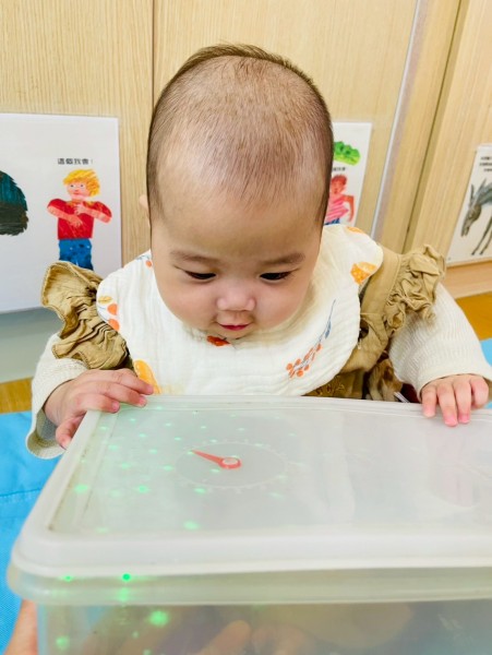 本週課程"箱子光影",利用箱子內擺放不同色彩光影手電筒,讓寶寶們在視覺上追朔光源,以及伸手探索光影投射在沙子、琉璃石所產生的變化,寶寶們神情相當融入其境呢!