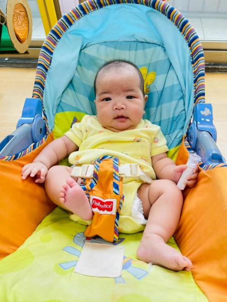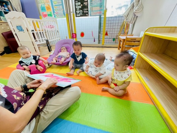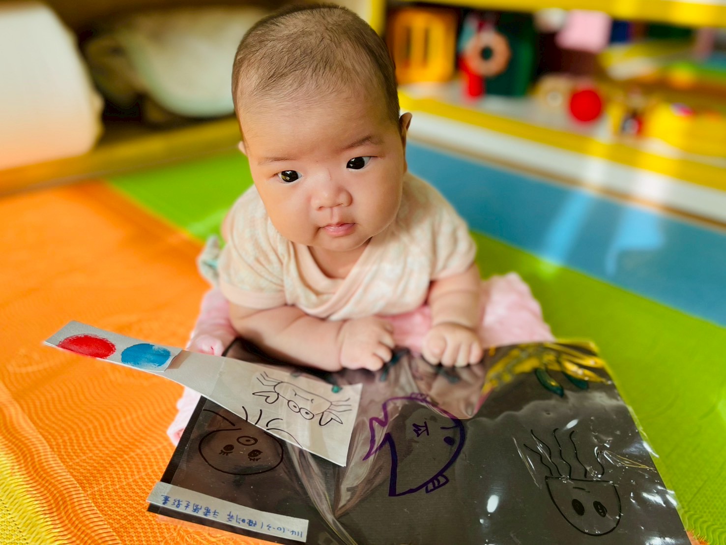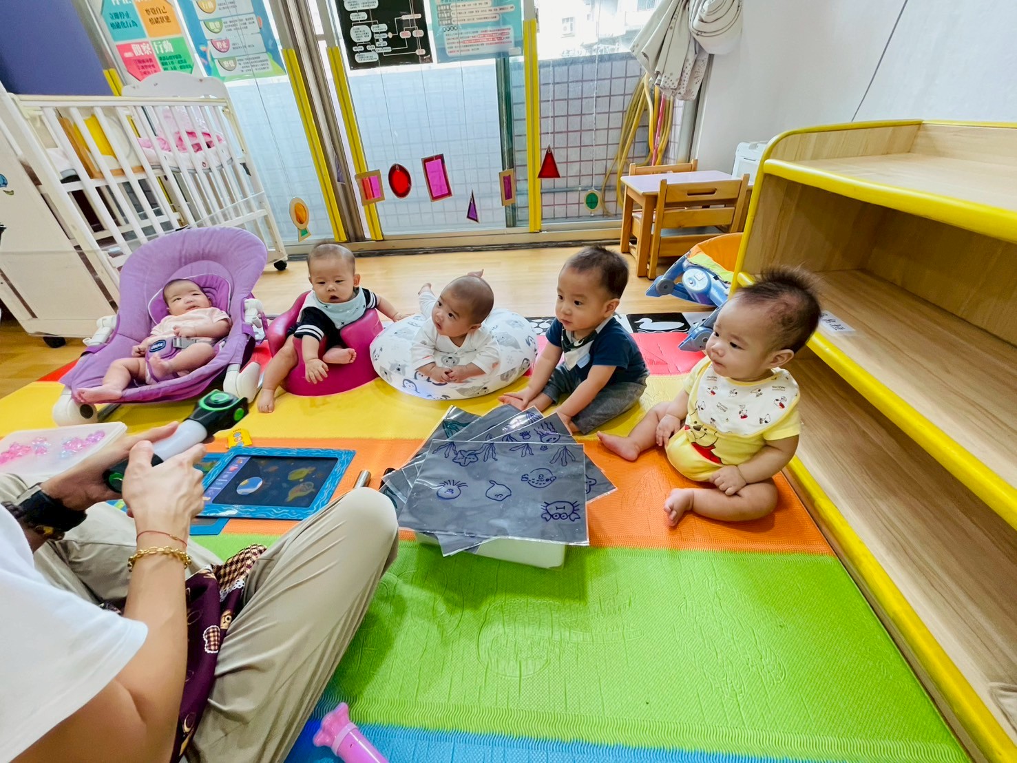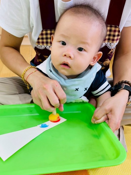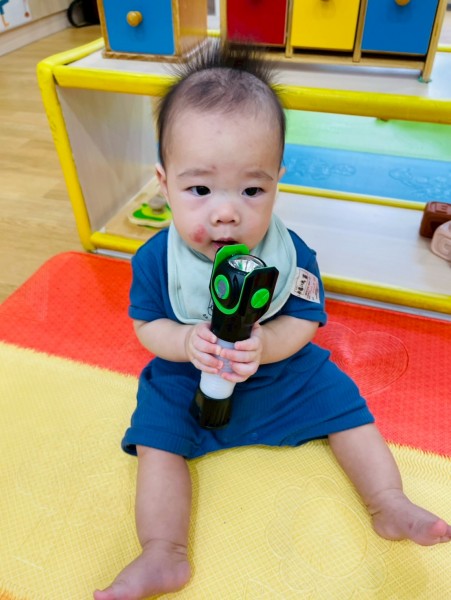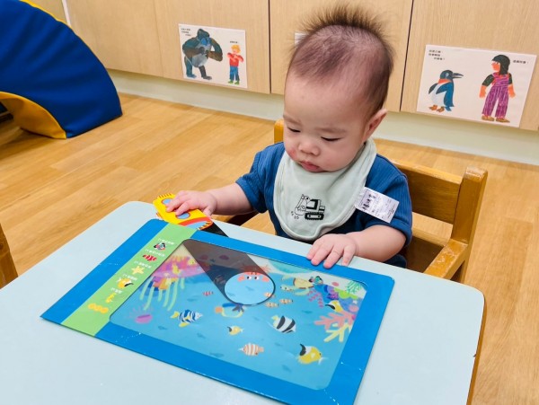 本週課程"箱子光影",利用箱子內擺放不同色彩光影手電筒,讓寶寶們在視覺上追朔光源,以及伸手探索光影投射在沙子、琉璃石所產生的變化,寶寶們神情相當融入其境呢!