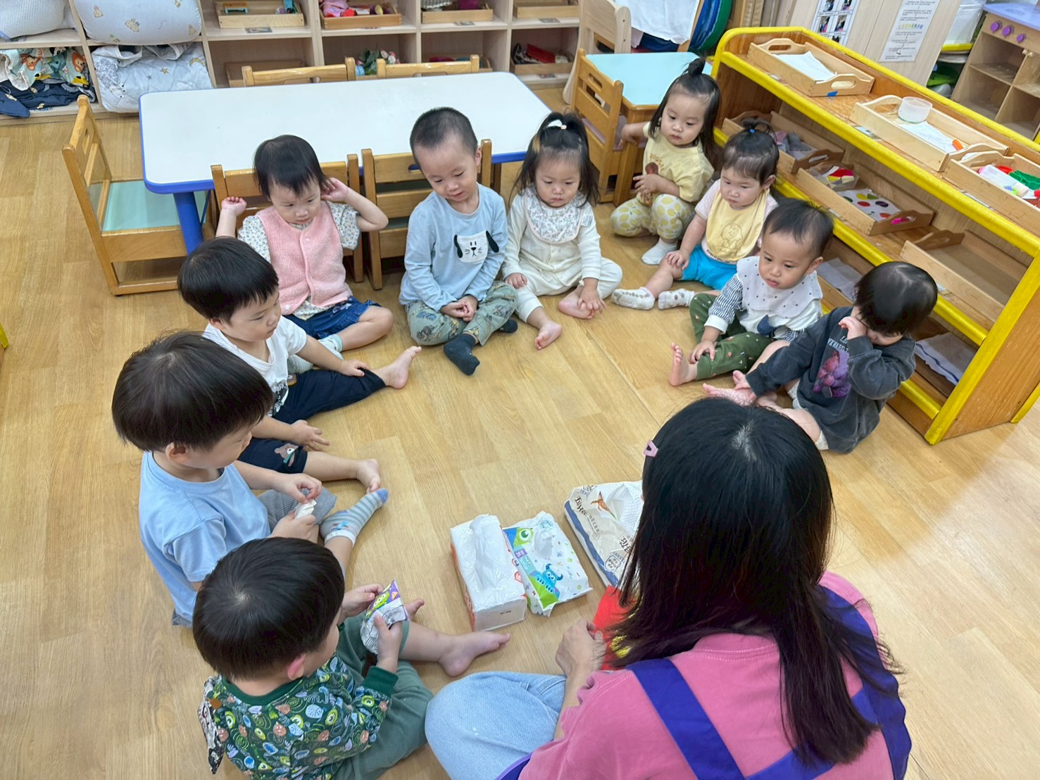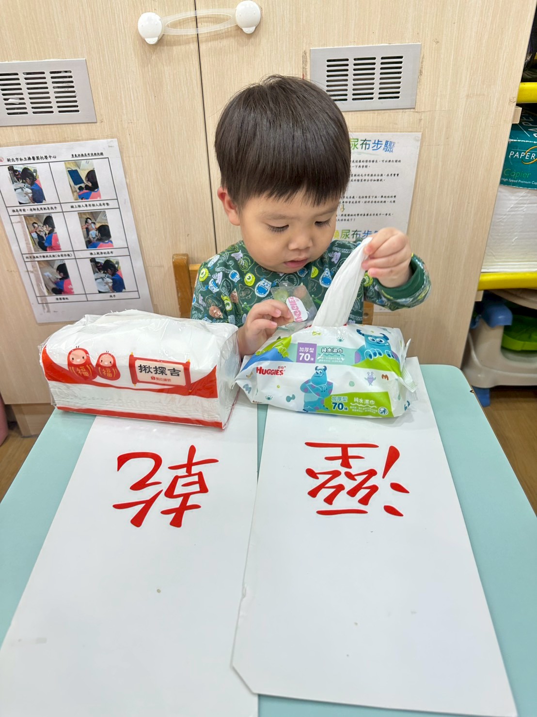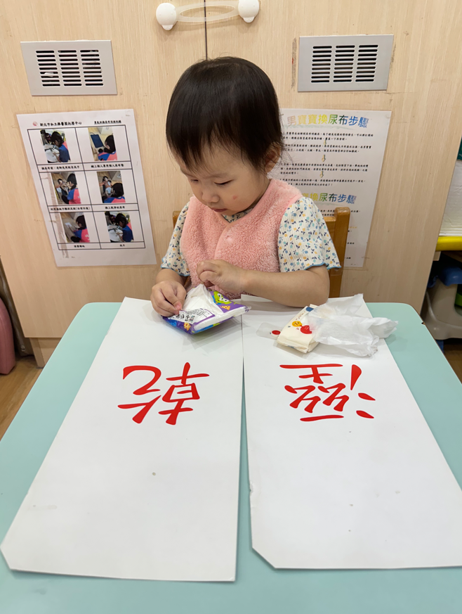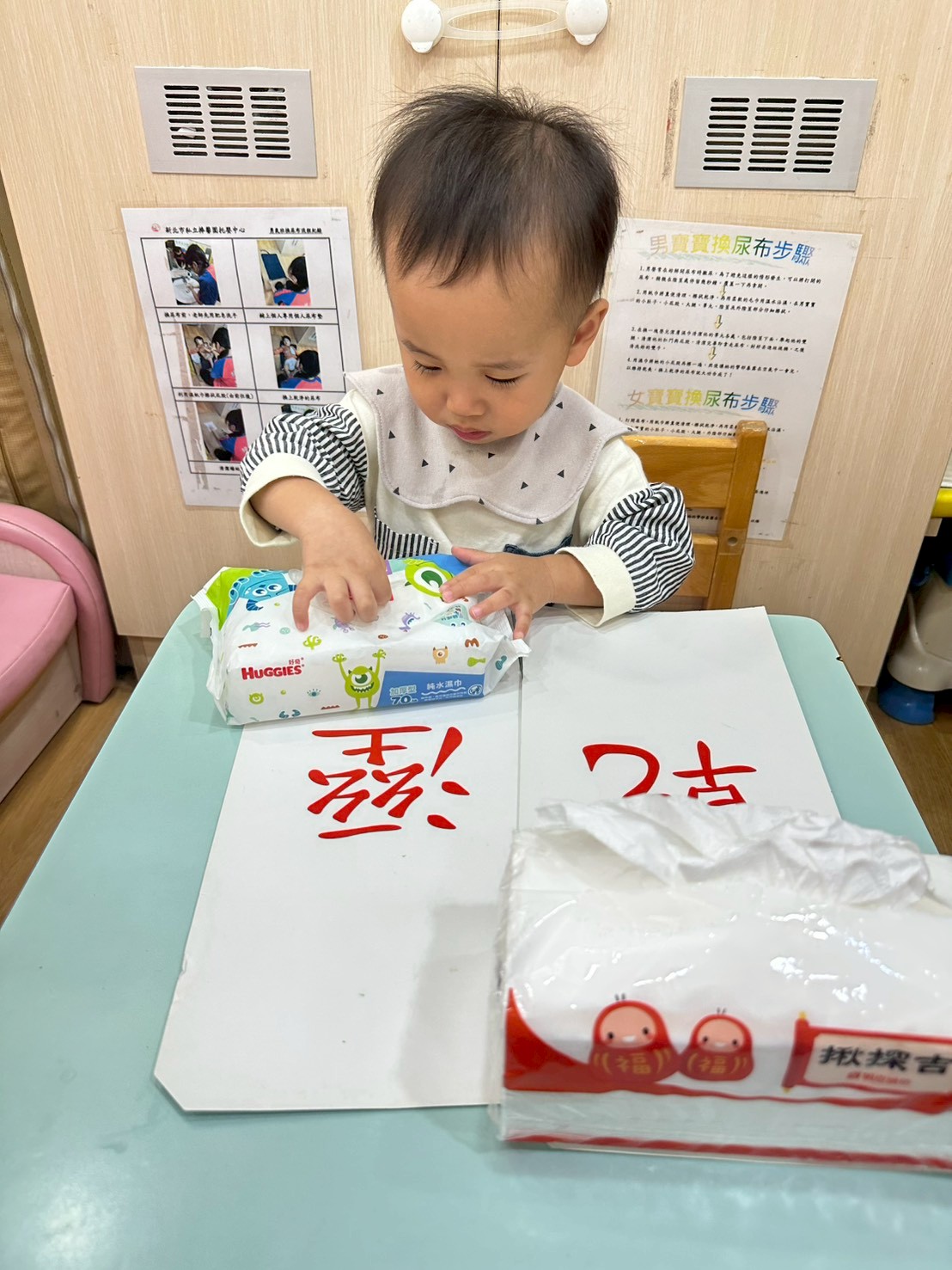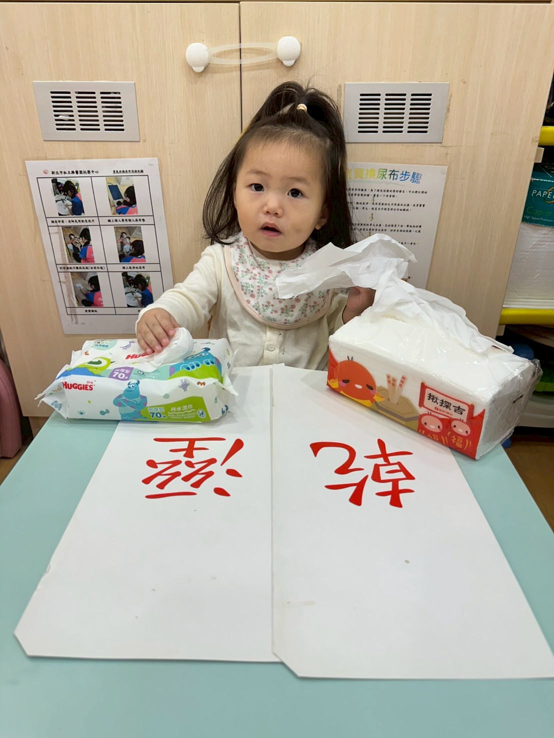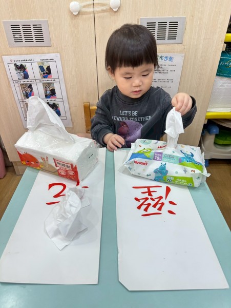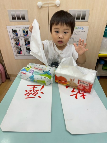 透過這次的主題帶孩子們認識平常常使用的不同紙張(衛生紙、濕紙巾、餐巾紙、一般A4紙、皺褶紙),認識紙張與觸摸紙張,並了解各種紙張的用途。