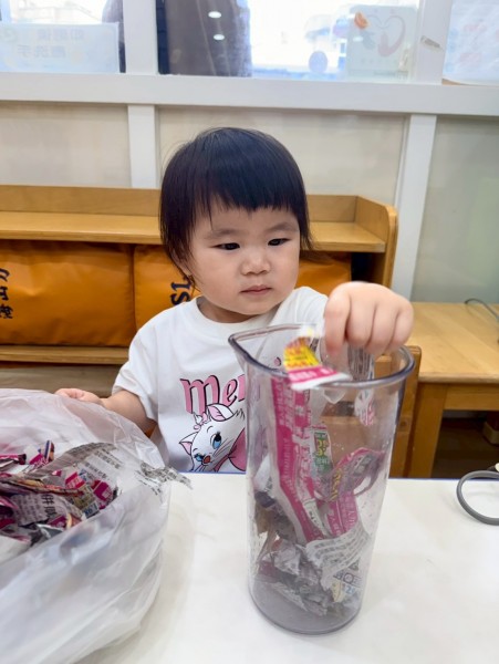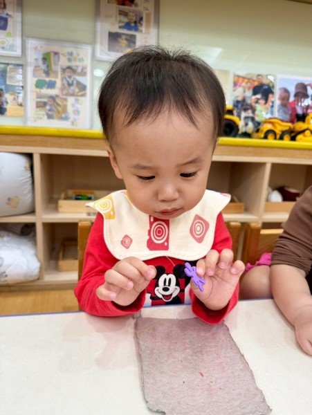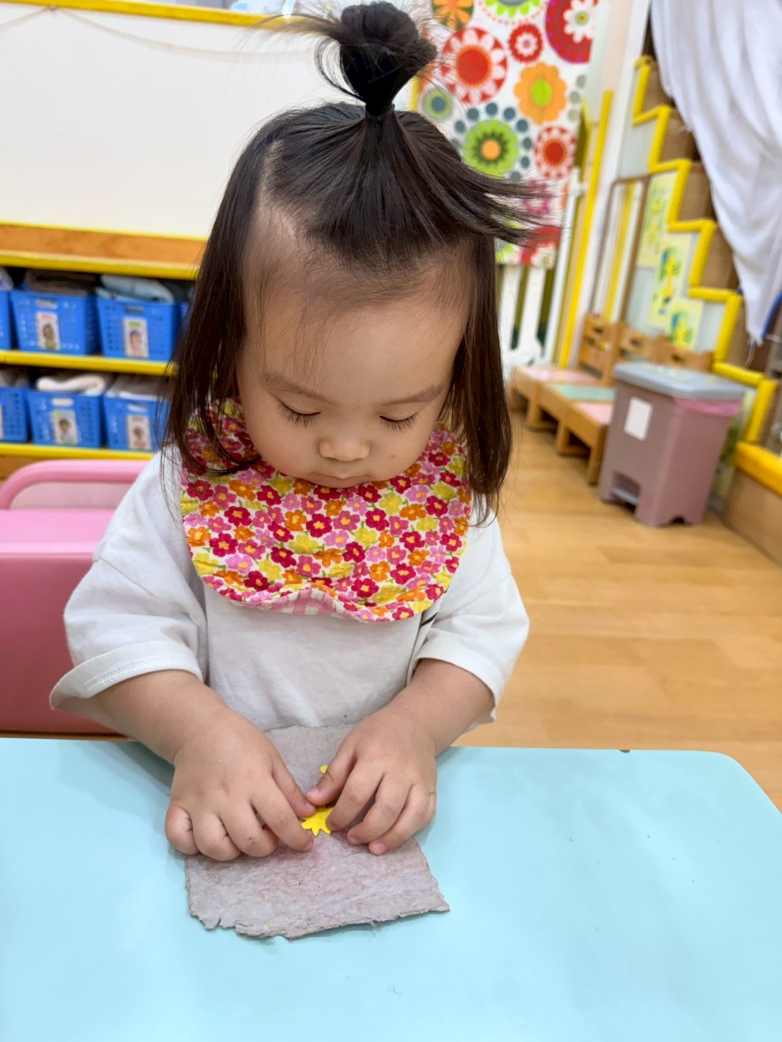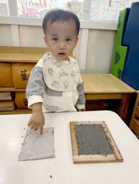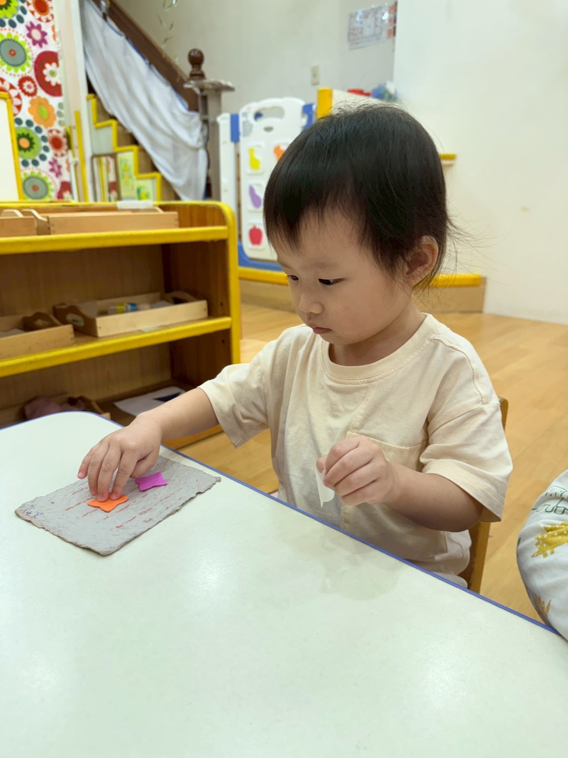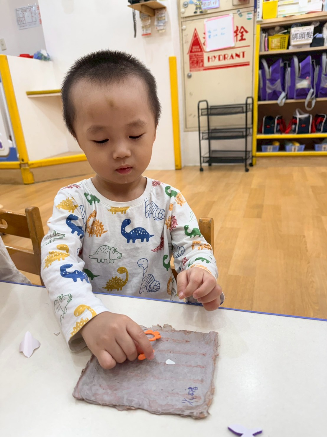 之後拿出泡棉貼紙讓寶貝們貼上在自己製作的再生紙上,完成屬於自己的作品。