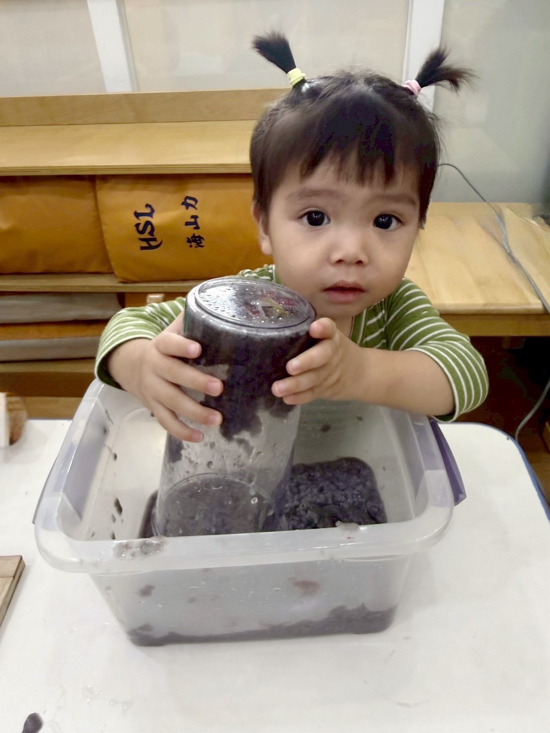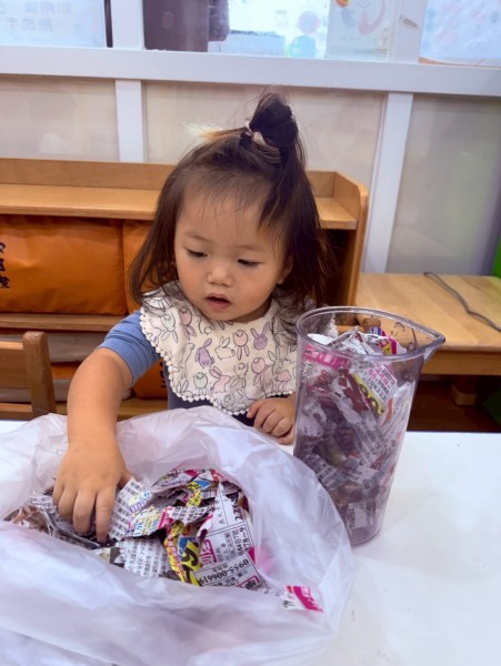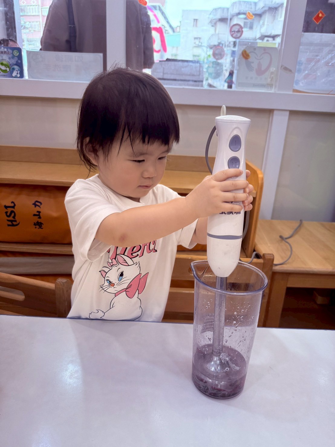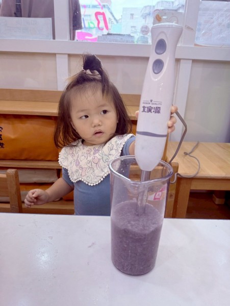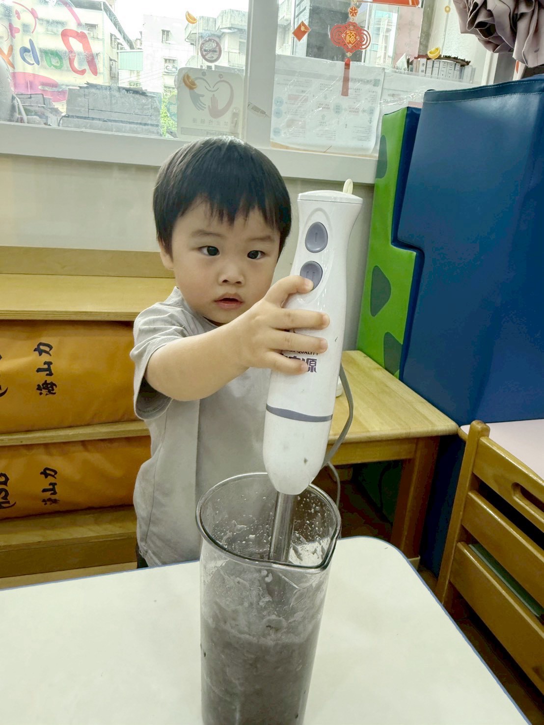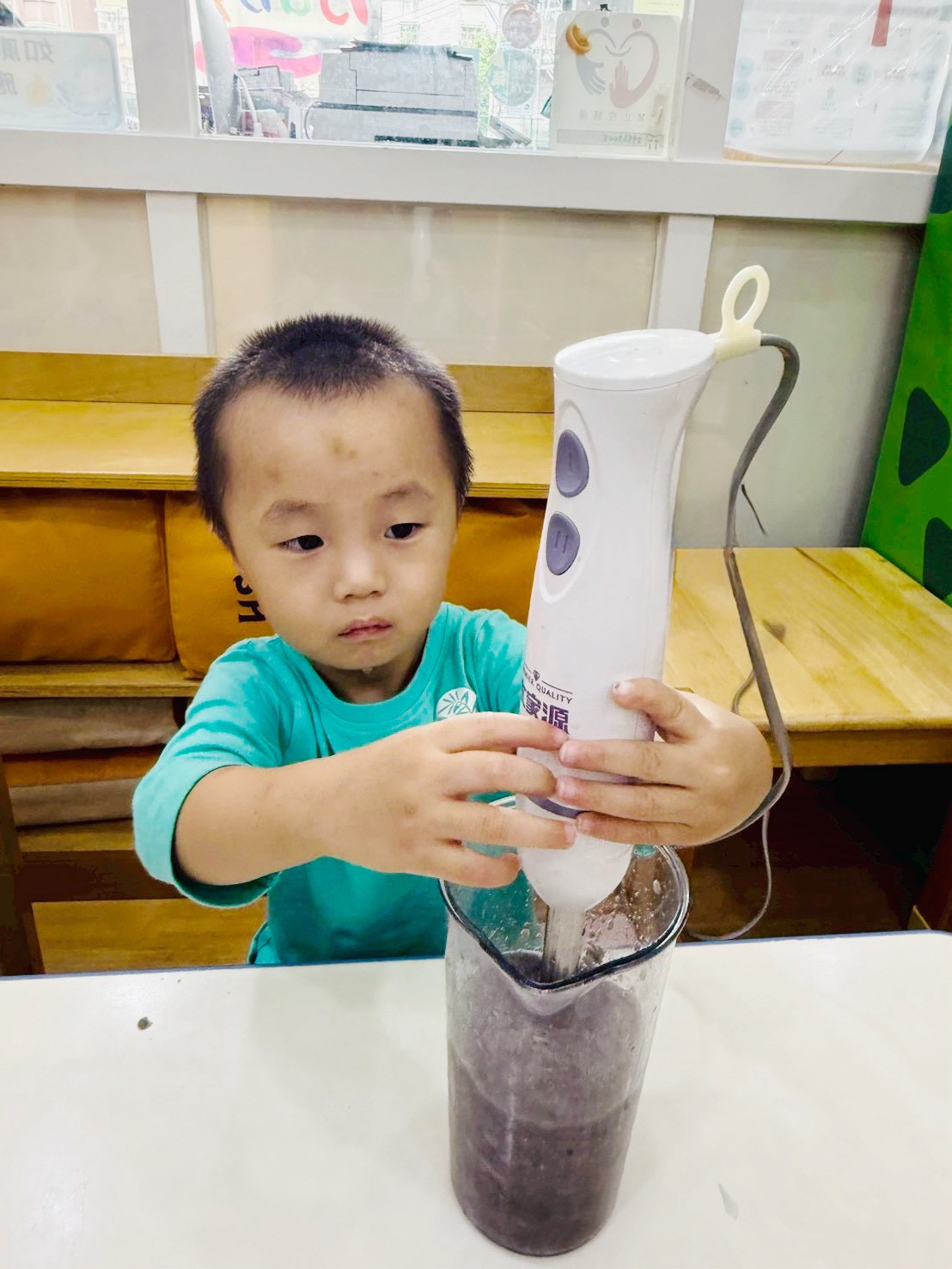 先讓寶貝把報紙撕成小小的,再把撕好的報紙放進料理機裡面打成紙漿
