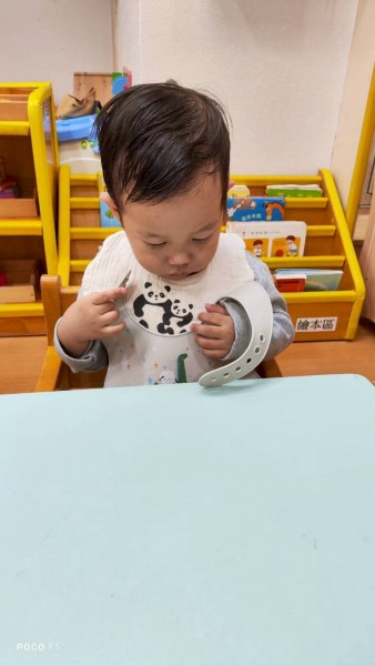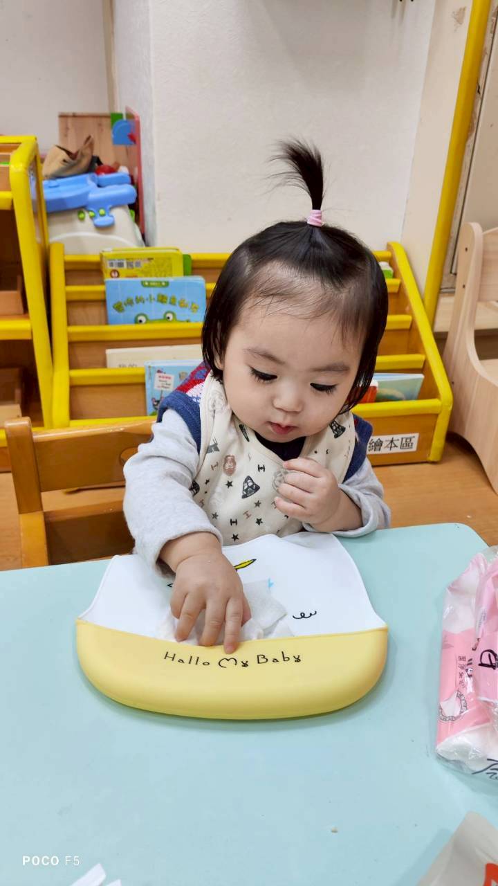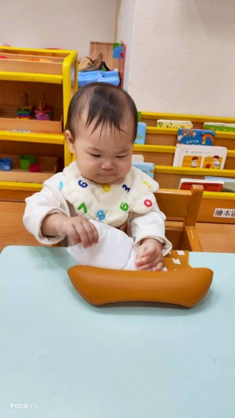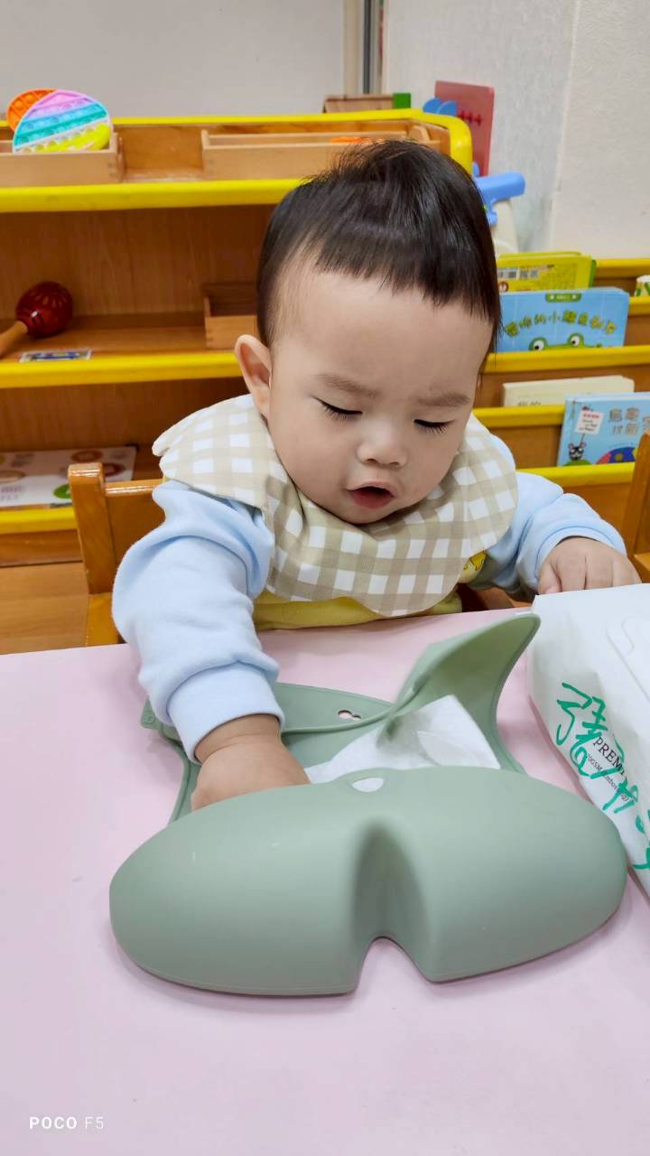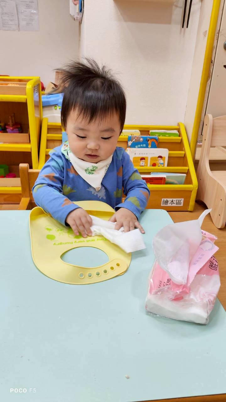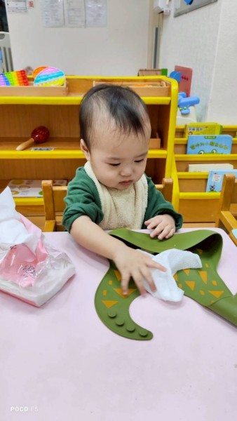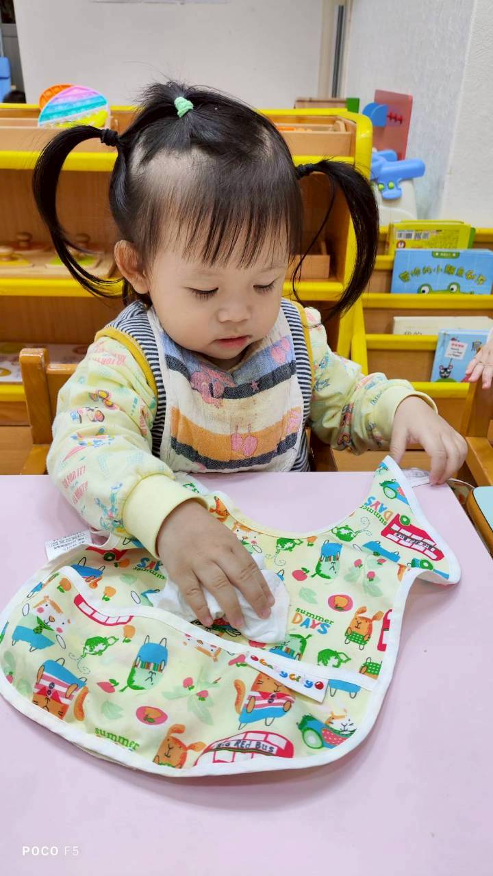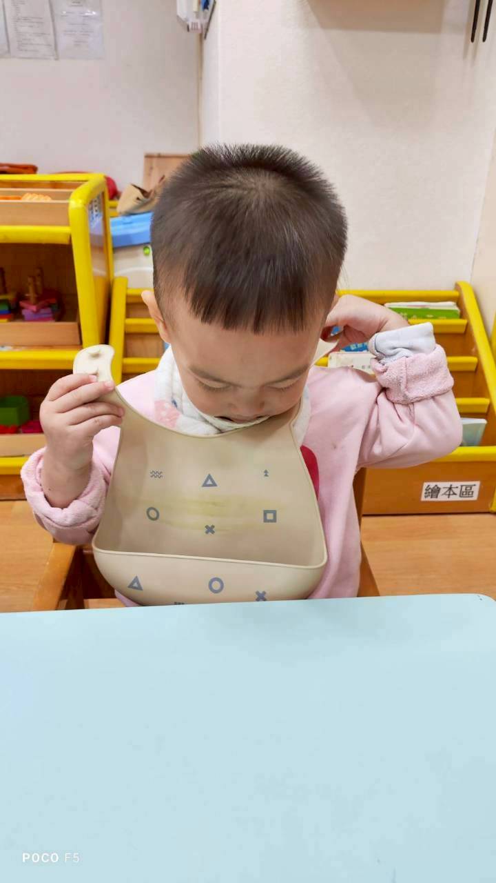當寶寶開始學自己拿湯匙吃飯時,引導學習自理拿圍兜兜與收拾擦拭,