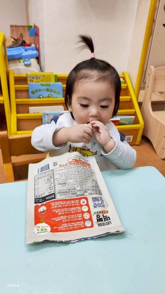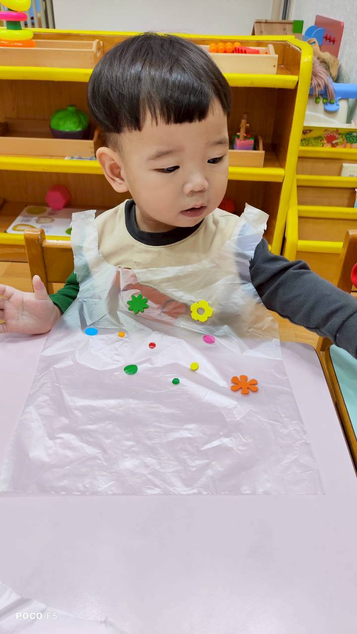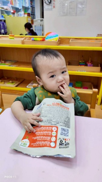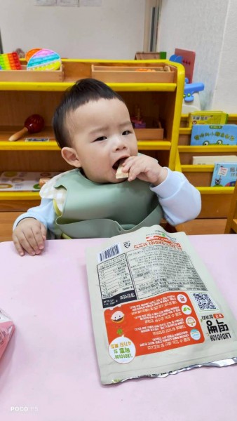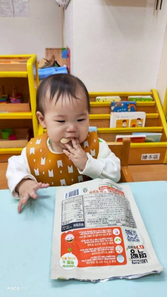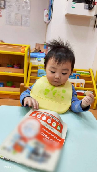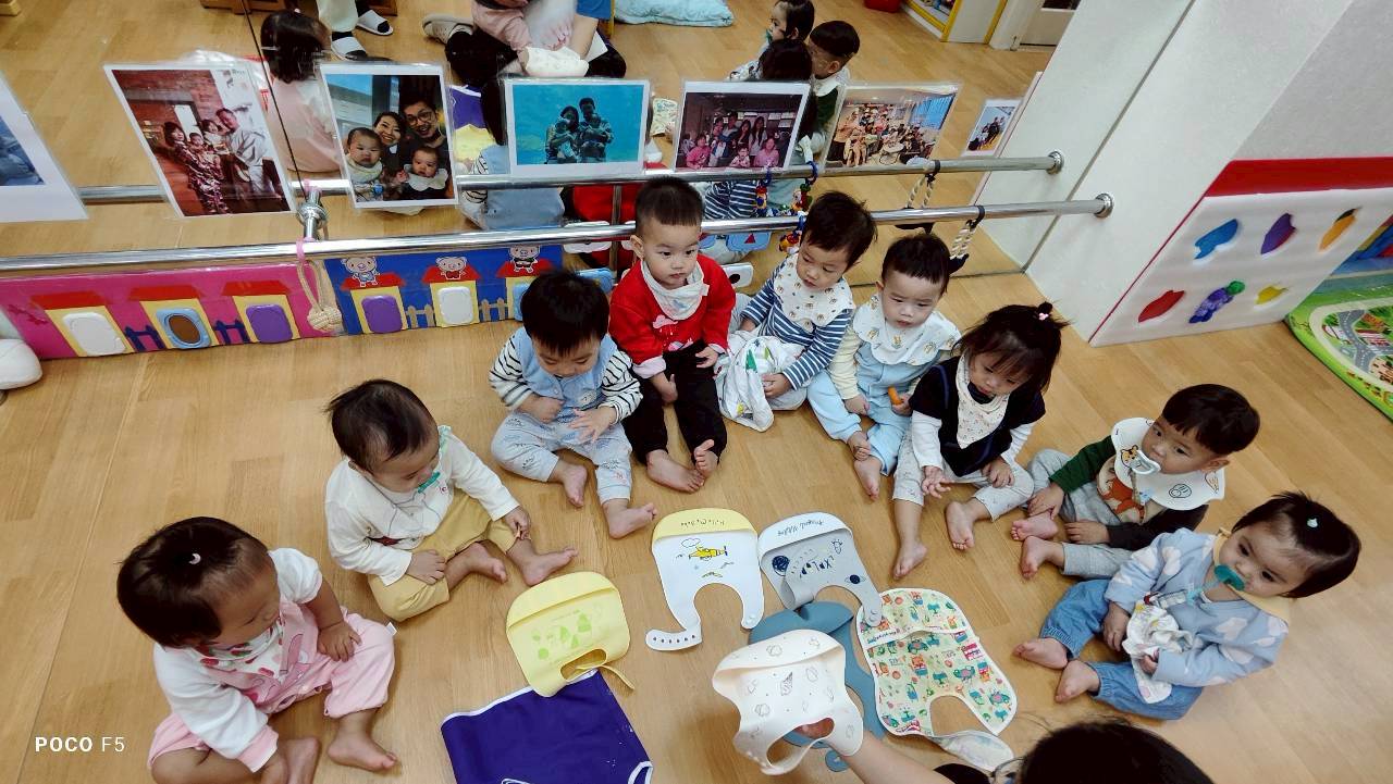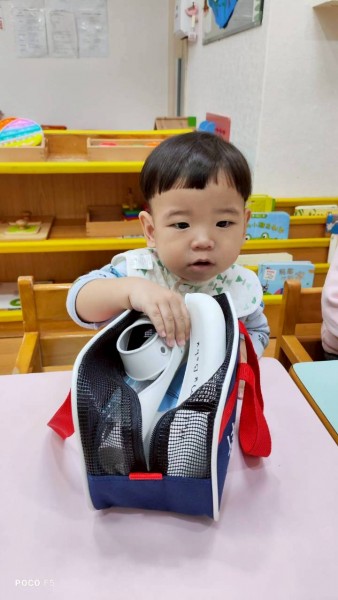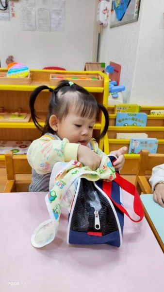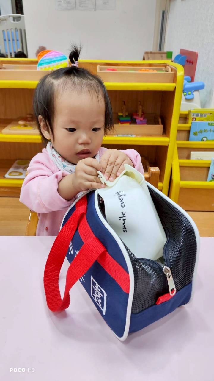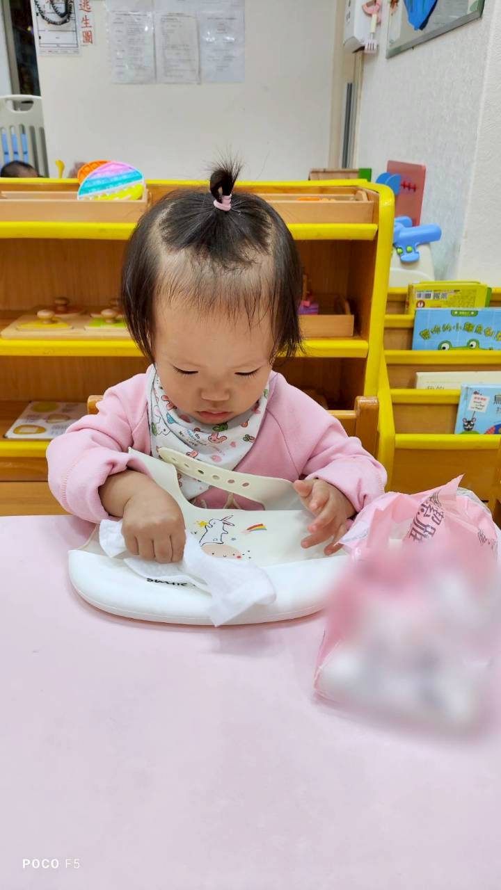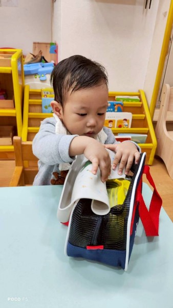 當寶寶開始學自己拿湯匙吃飯時,引導學習自理拿圍兜兜與收拾擦拭,