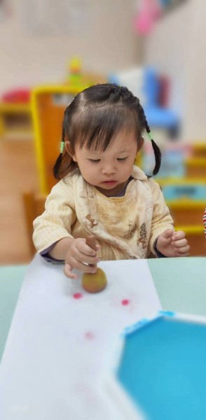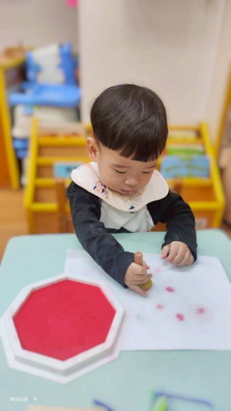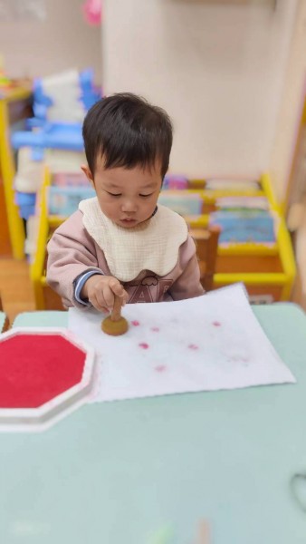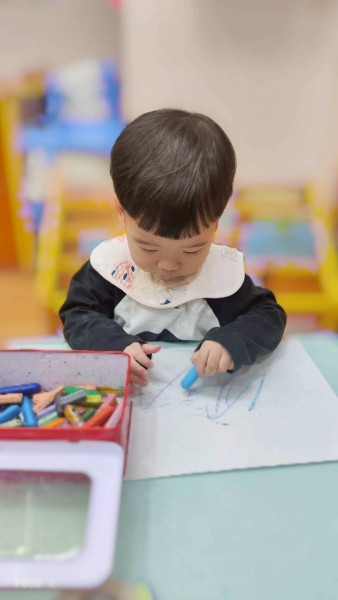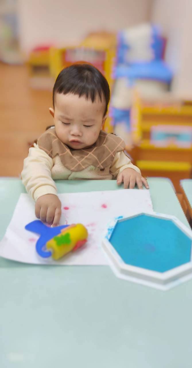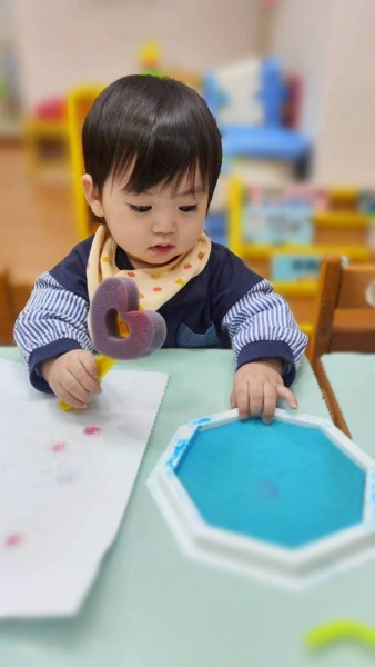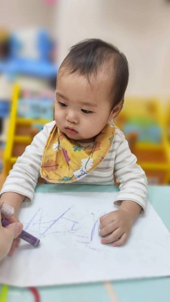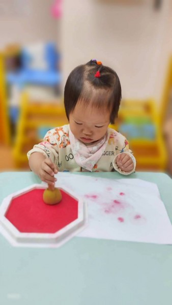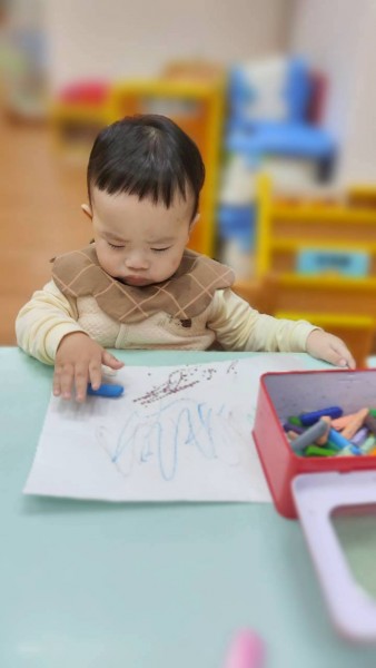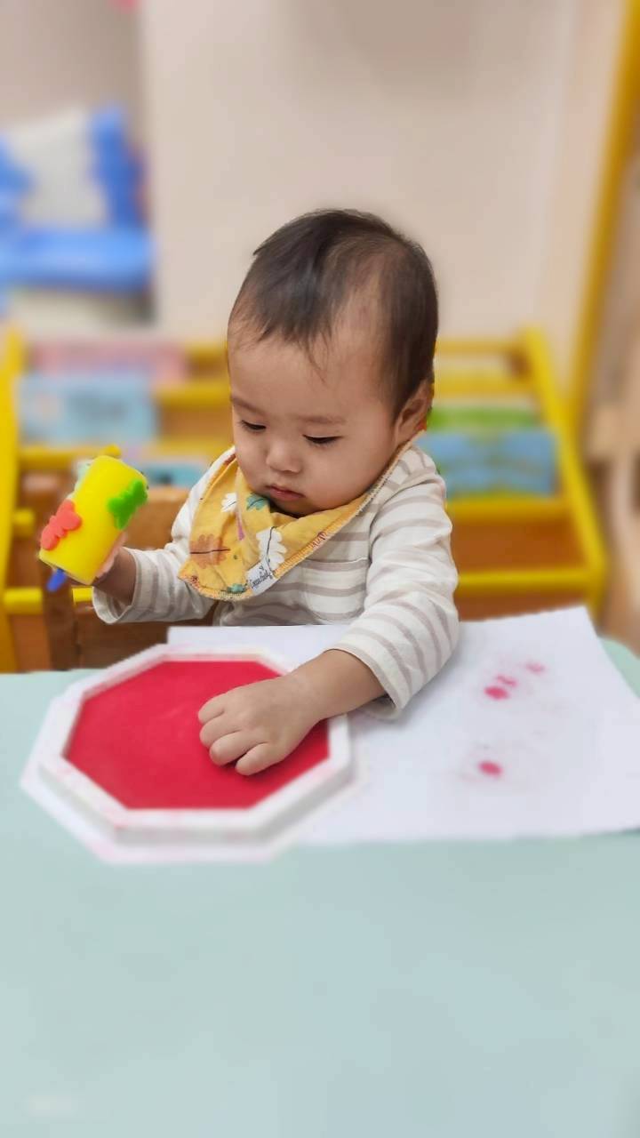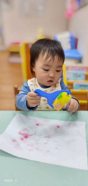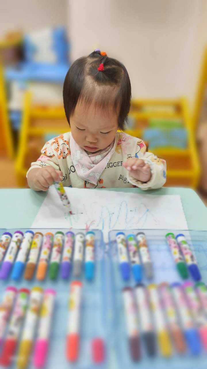 讓寶寶認識粗蠟筆、彩色筆、蓋印畫畫,任意抓握、點畫、塗鴉的體驗,