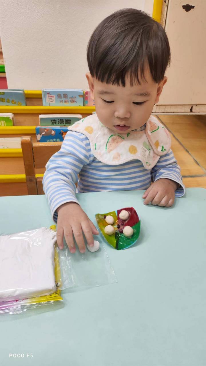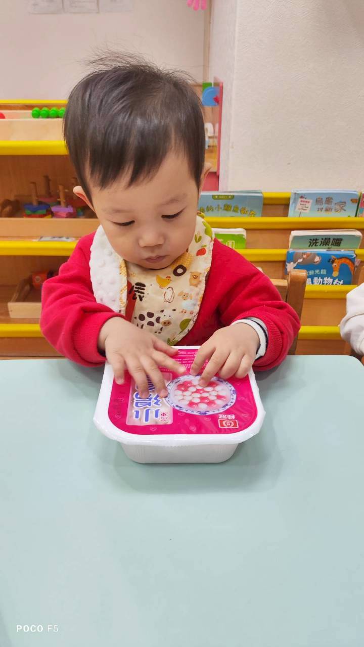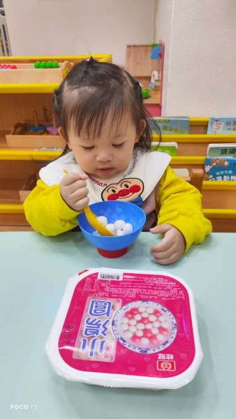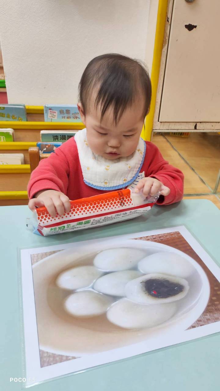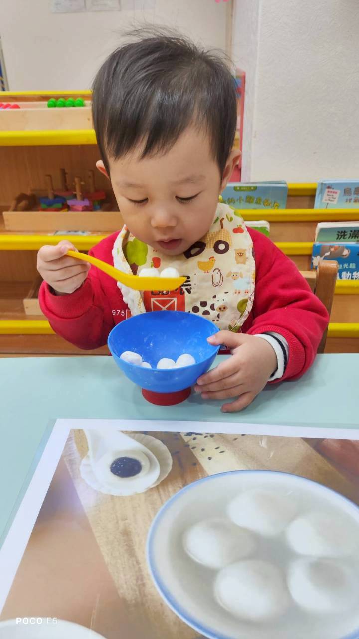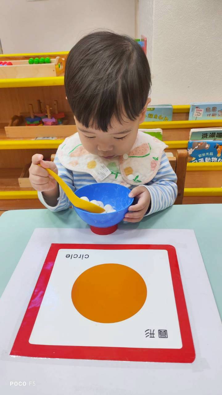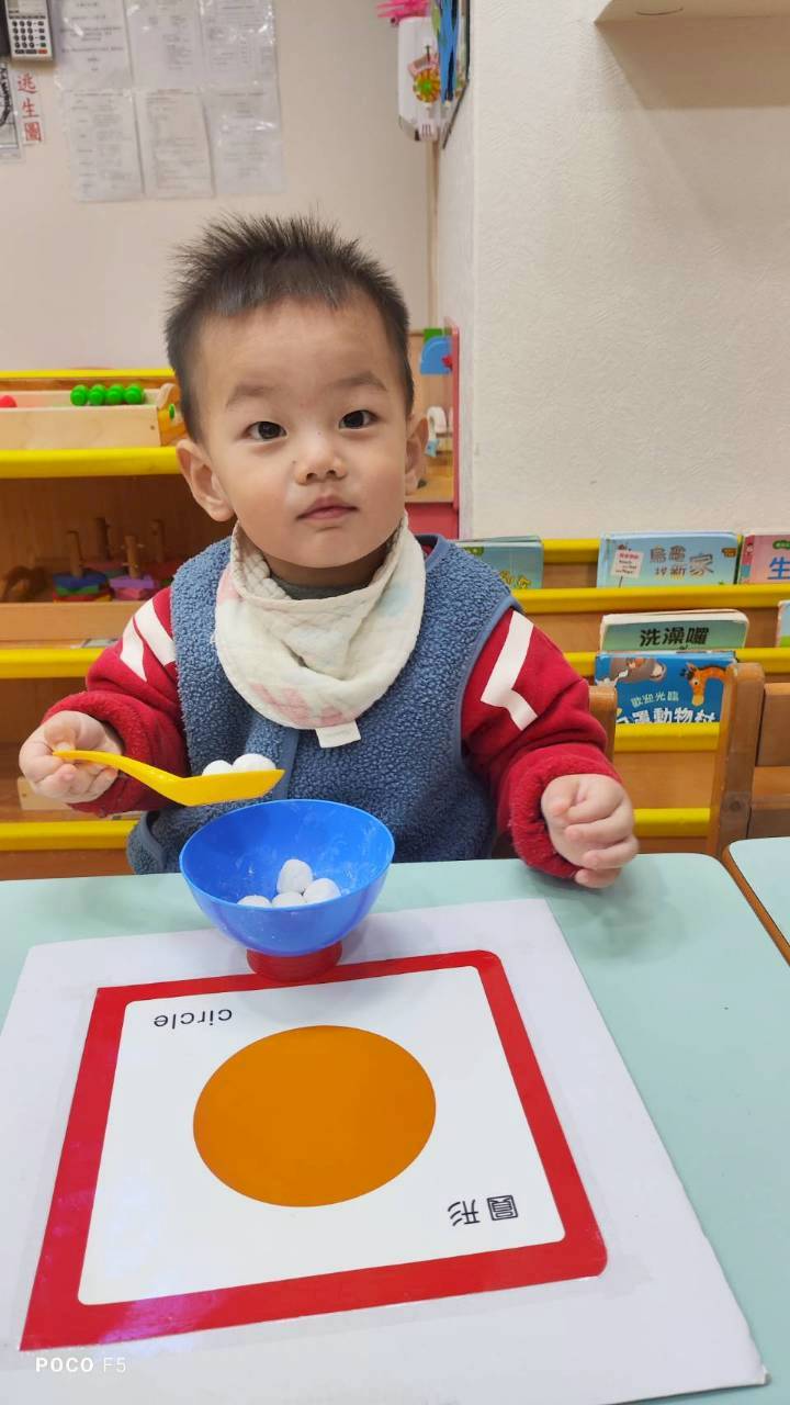這週課程認識白色:湯圓。請孩子用湯勺撈起湯圓,對小小孩來說,