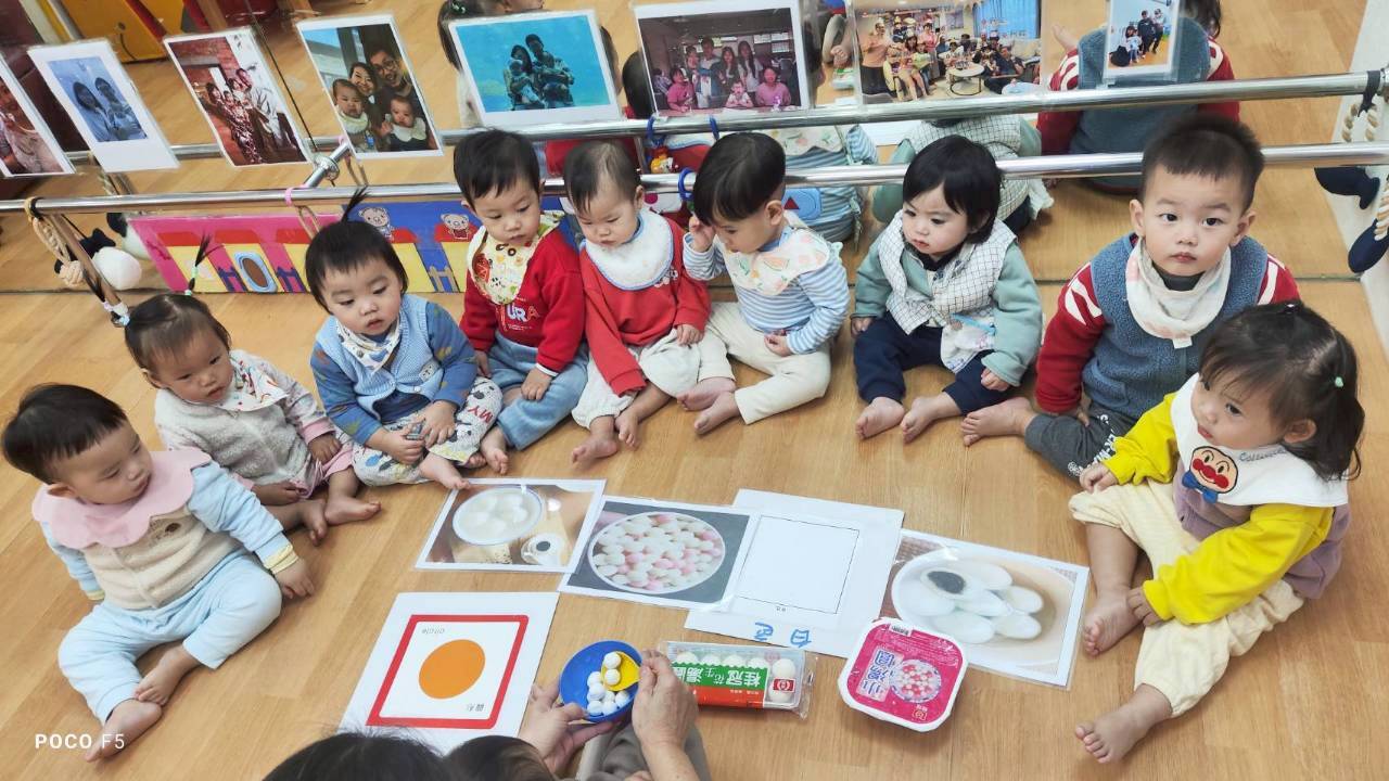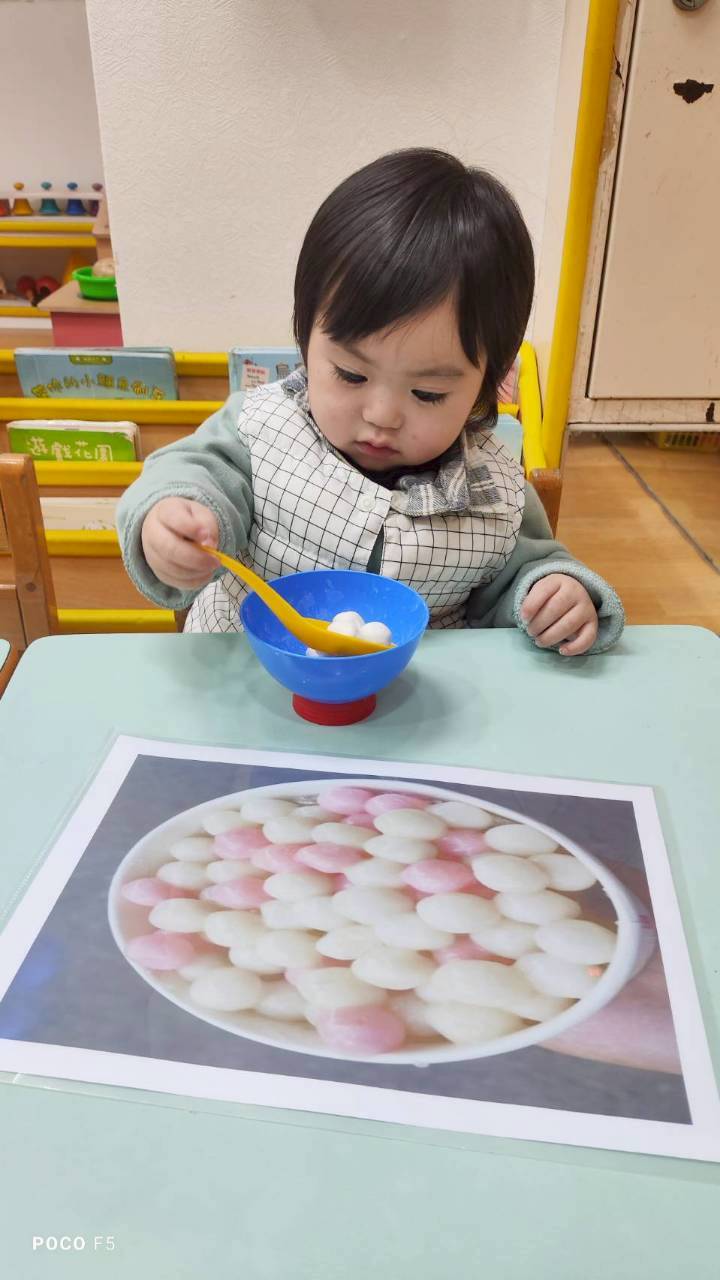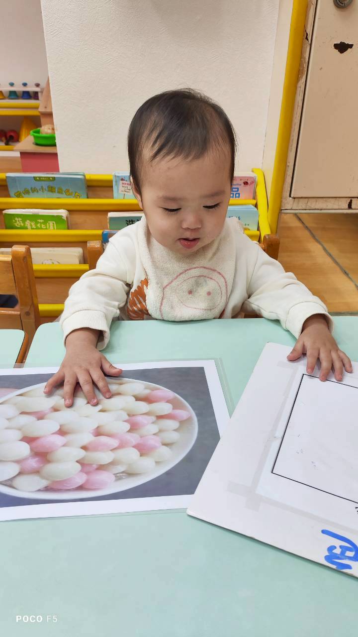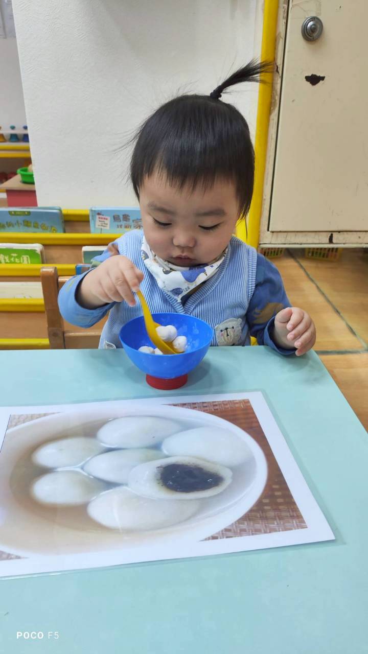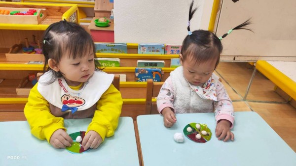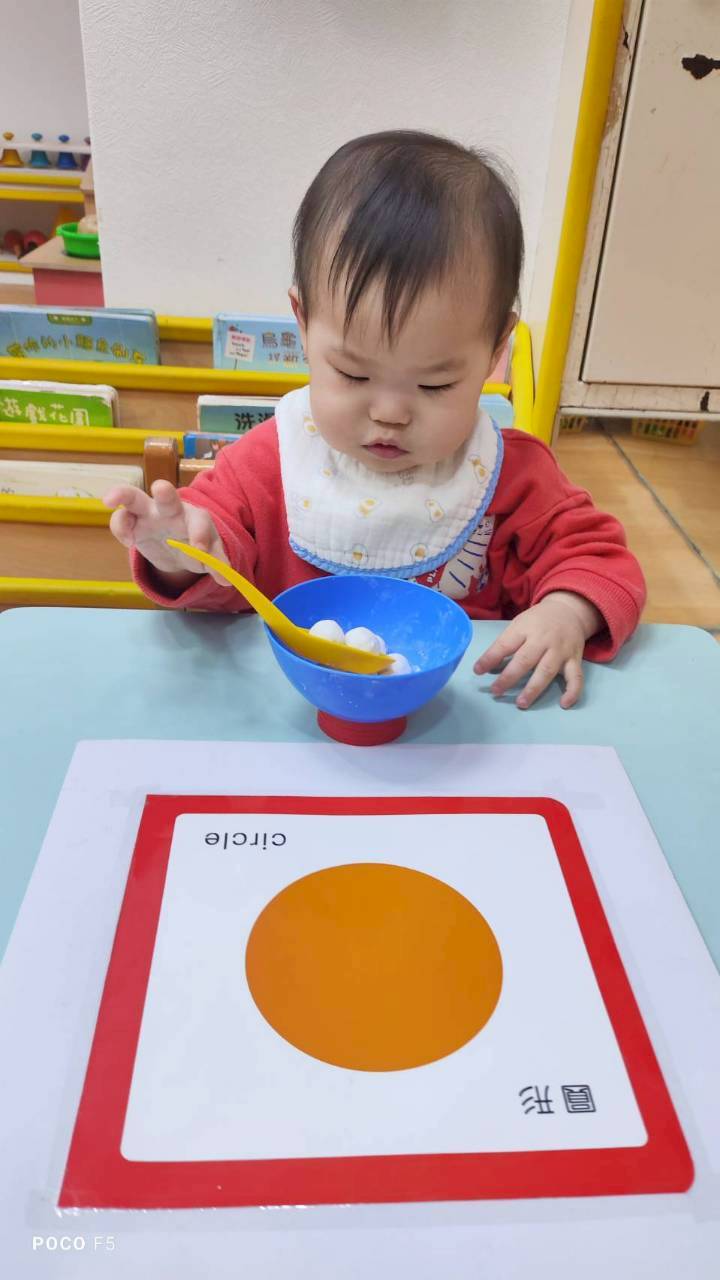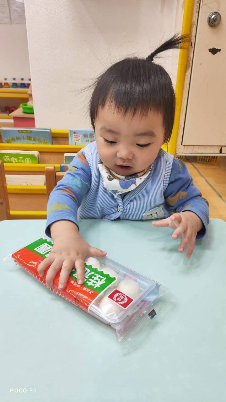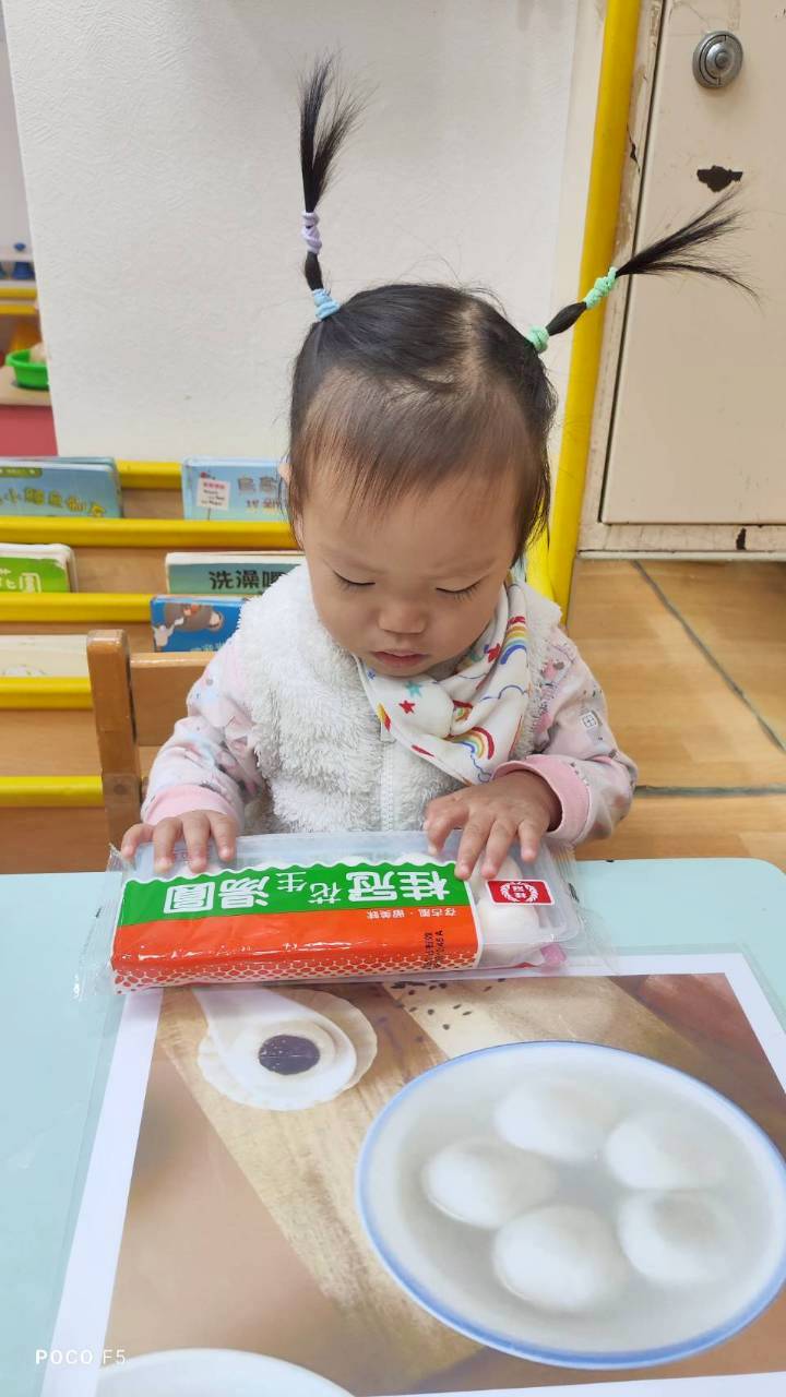 這週課程認識白色:湯圓。請孩子用湯勺撈起湯圓,對小小孩來說,