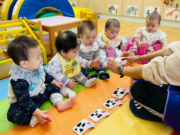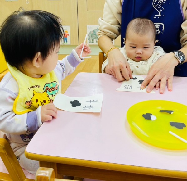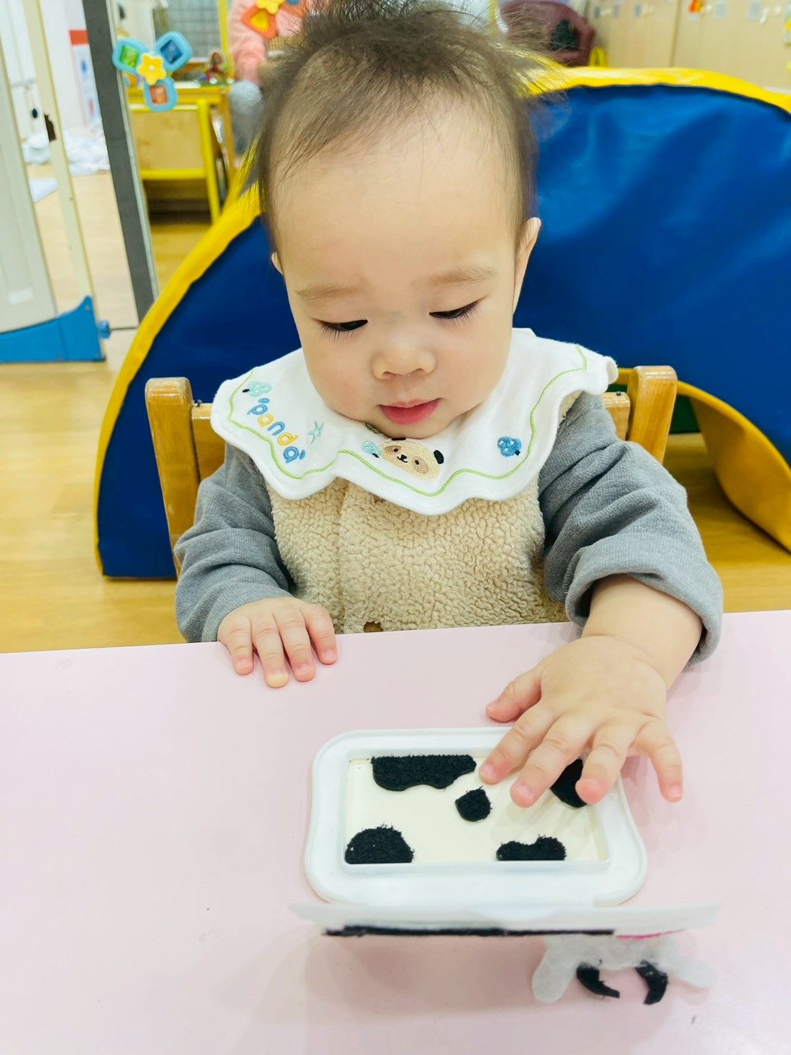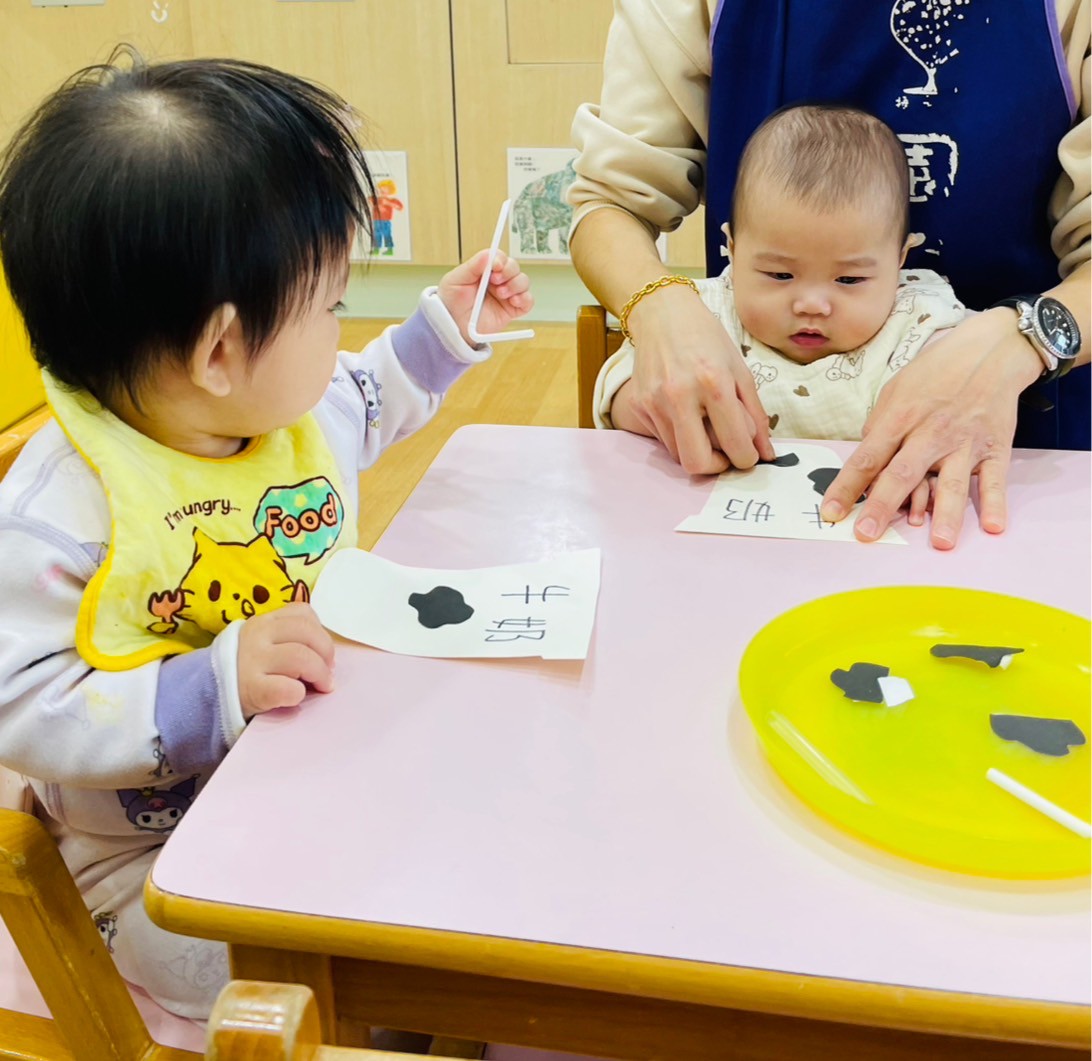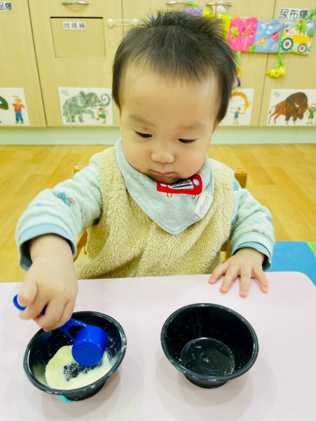 讓寶寶摸一摸白色奶粉增加手部觸覺刺激,
