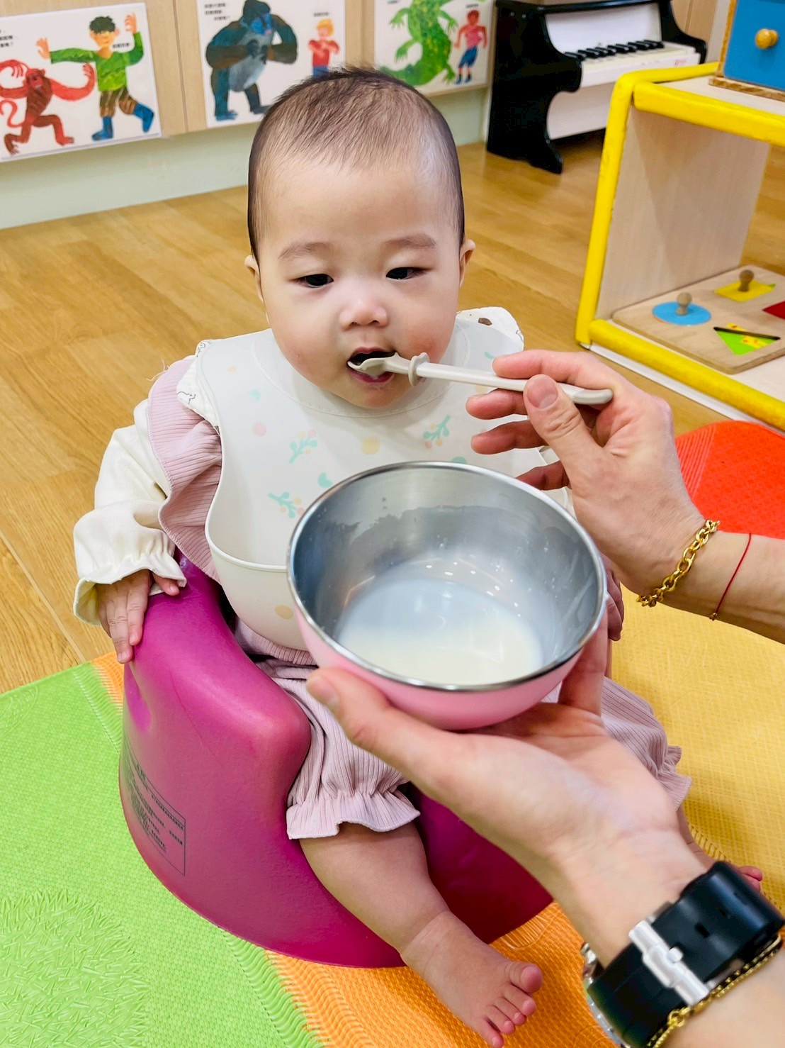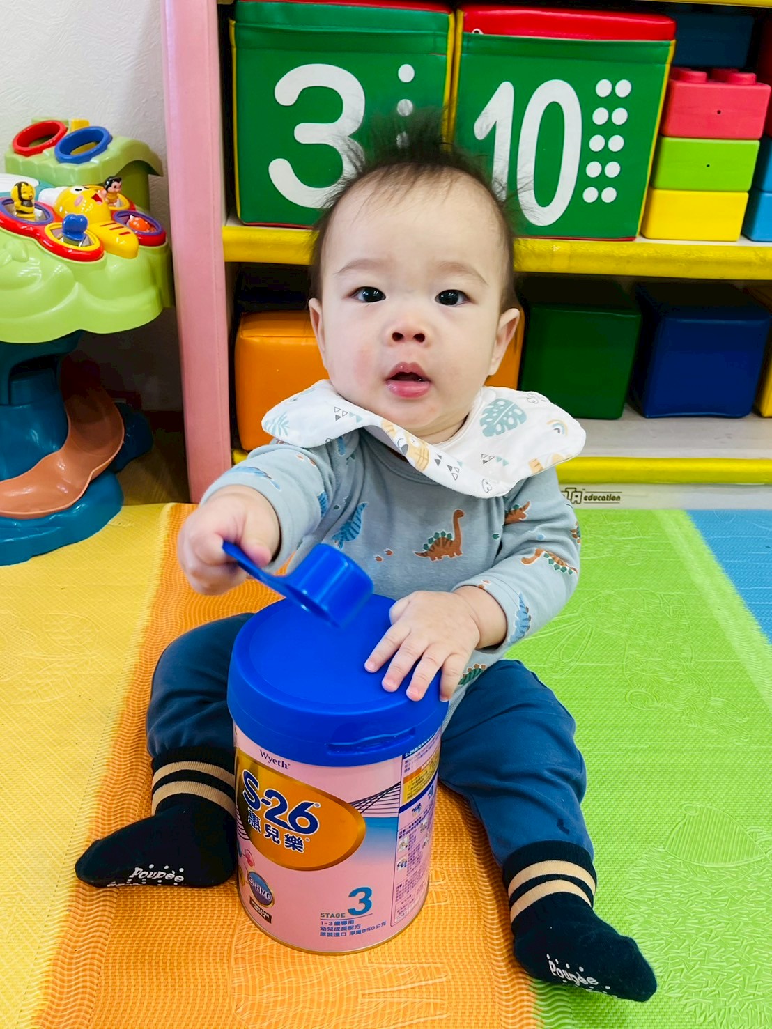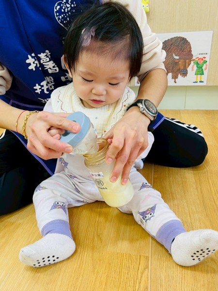 較大寶寶再透過手指抓握湯匙練習挖取奶粉,