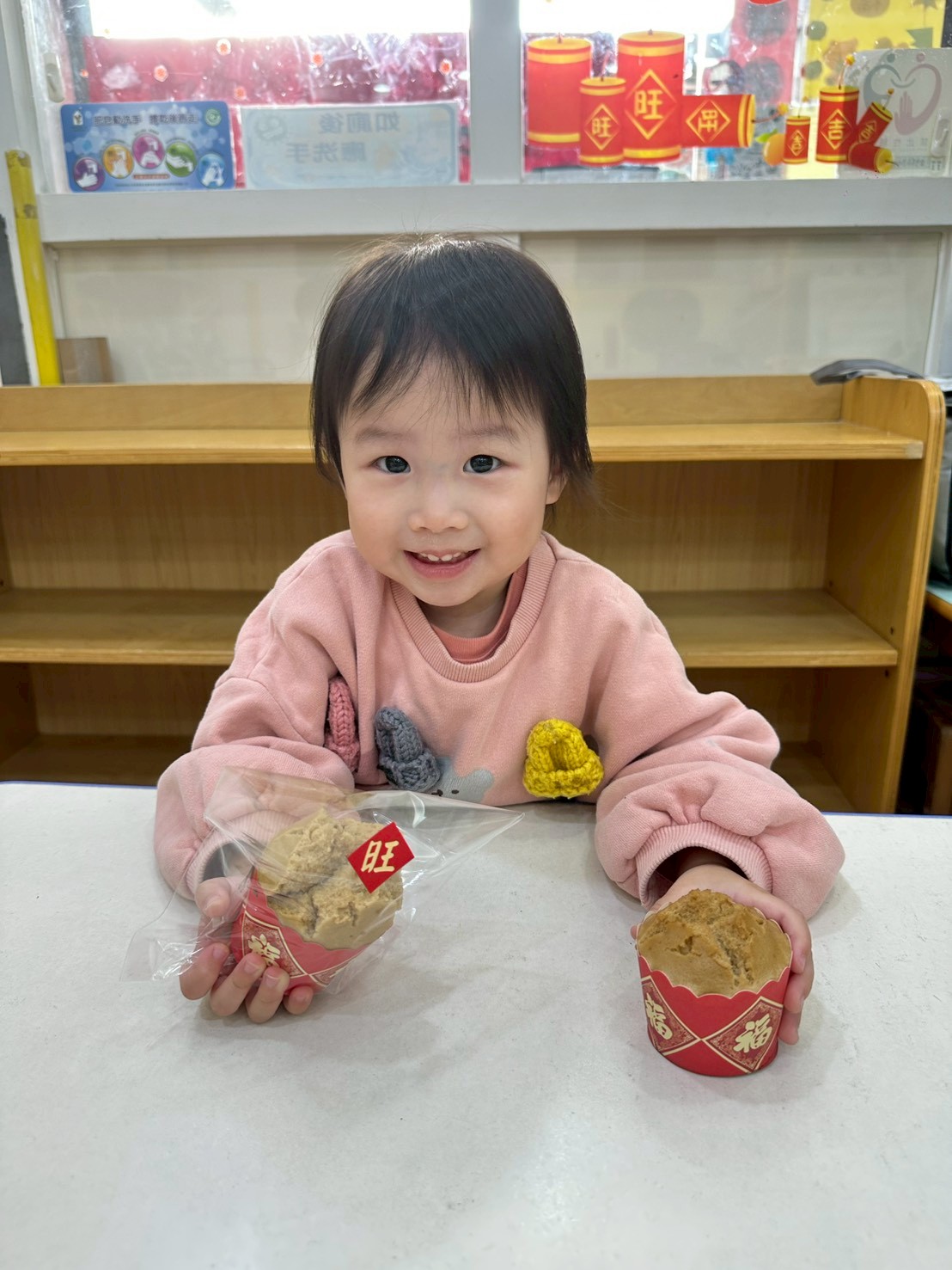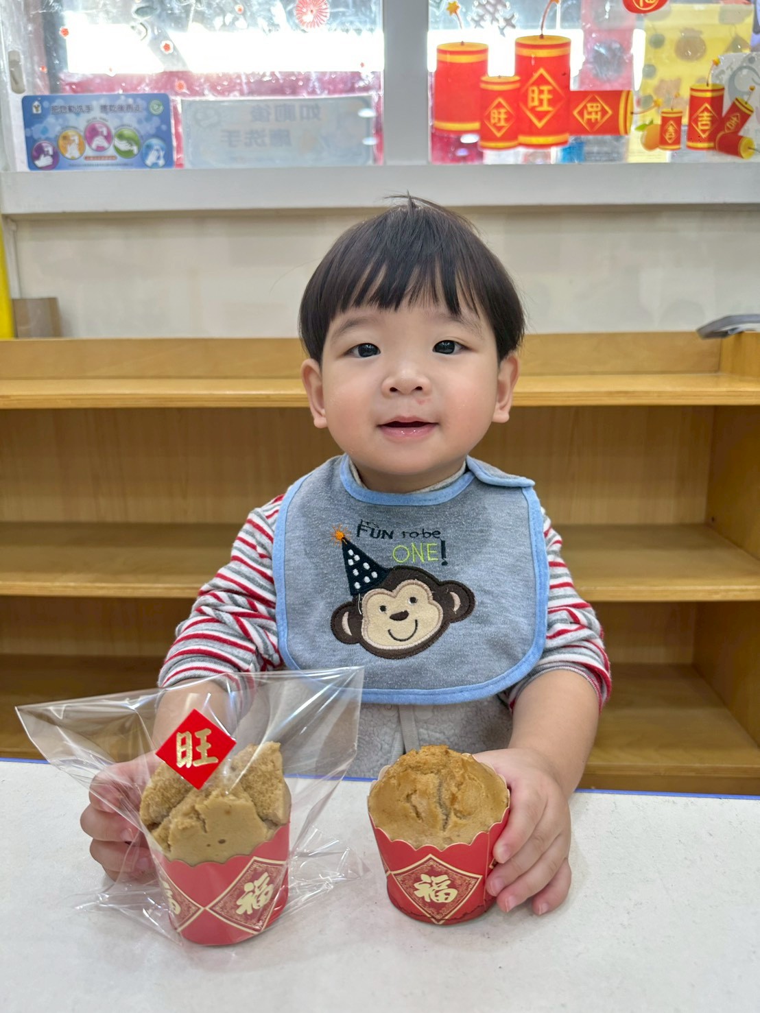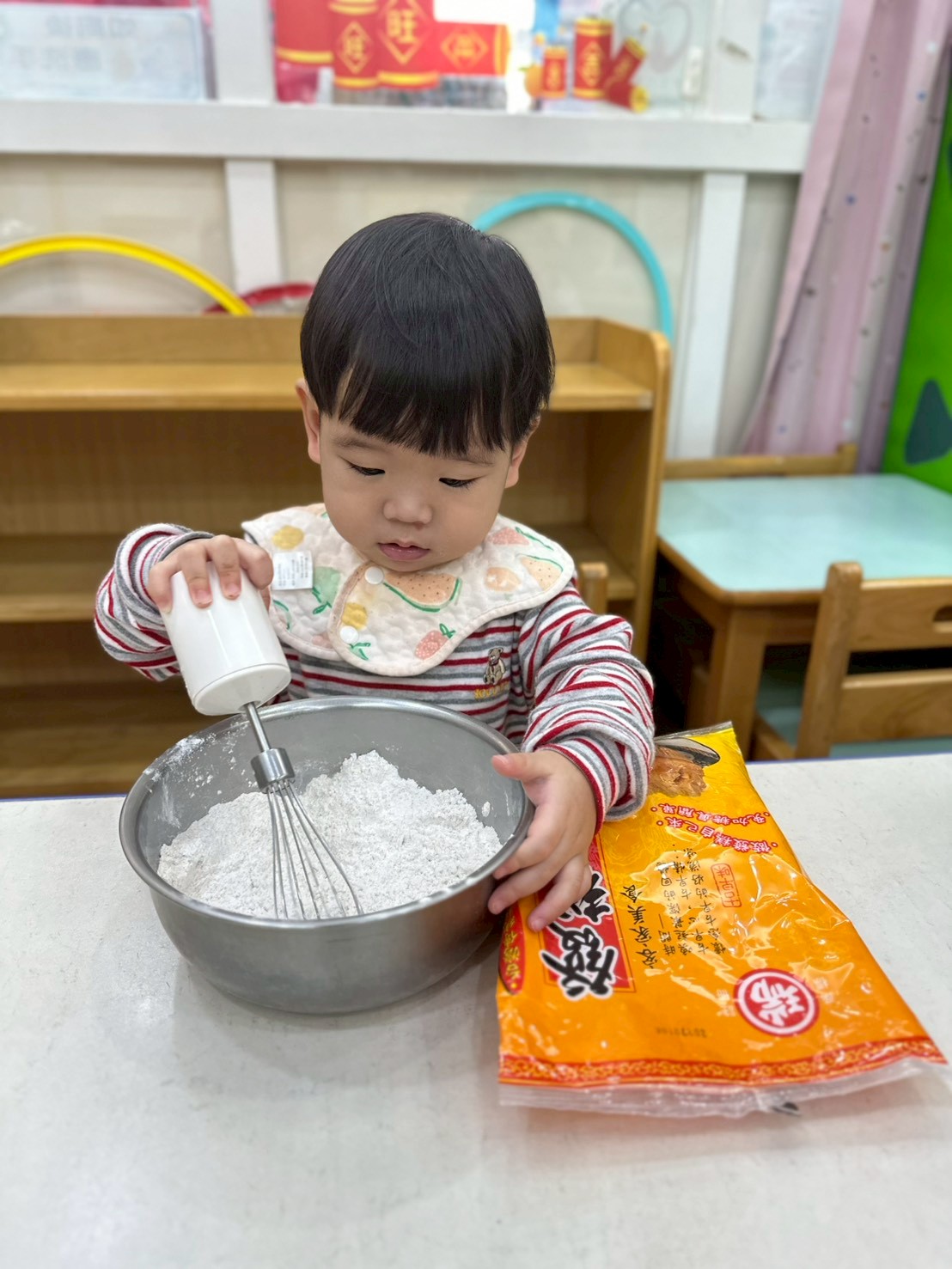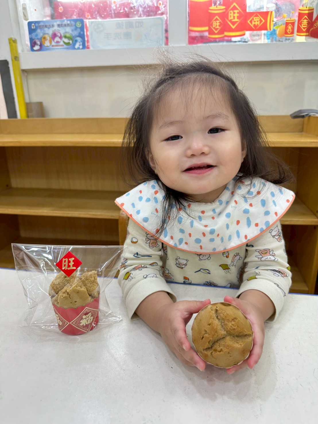 準備迎接過新年啦!!帶寶貝們體驗做發糕的樂趣,動動小手攪拌麵粉,增強手部的小肌肉動作,從中體驗樂趣與認識過年節慶的食物,還可以帶回家和爸爸媽媽一起享用。祝寶貝們:新年快樂~~