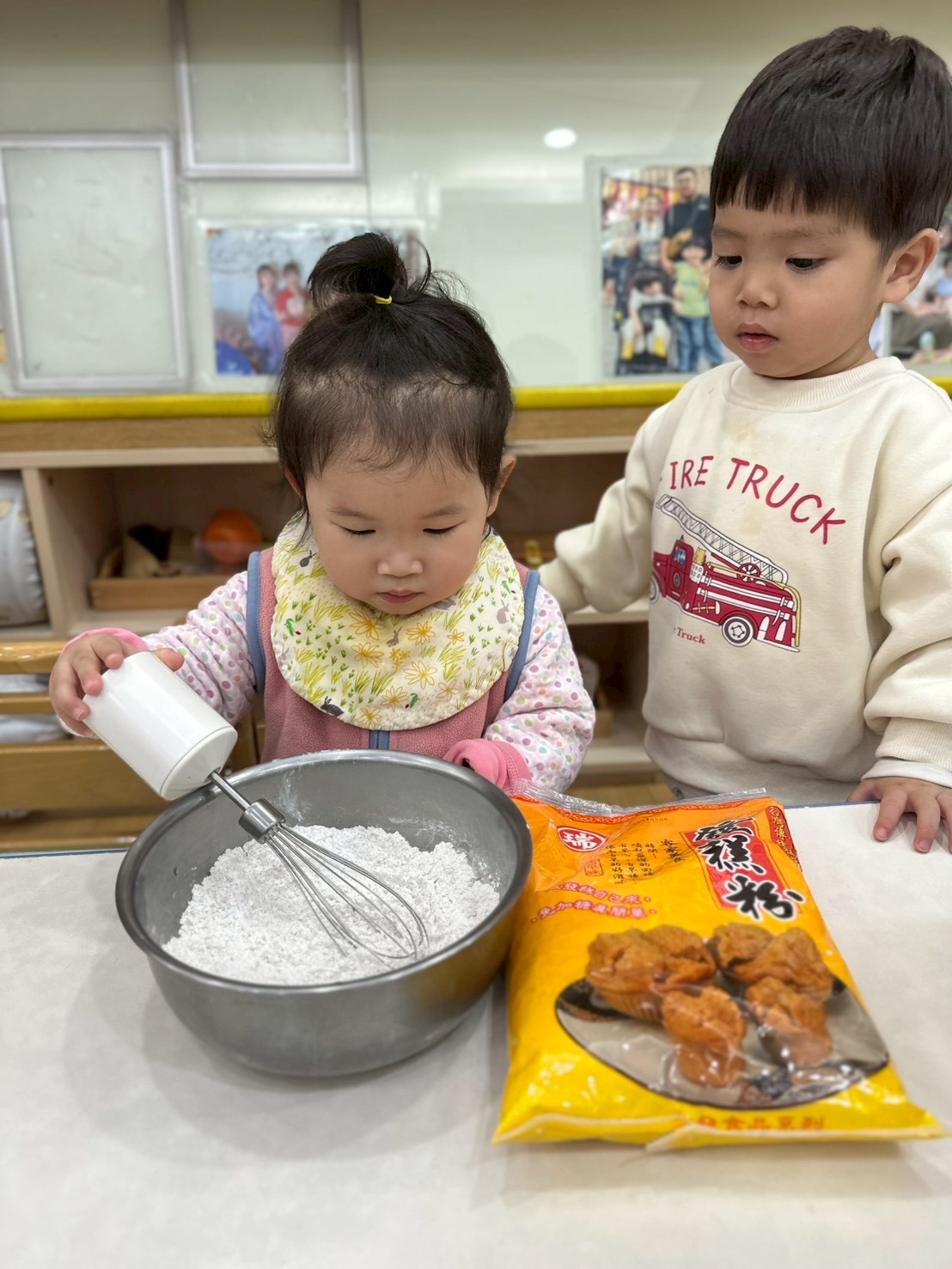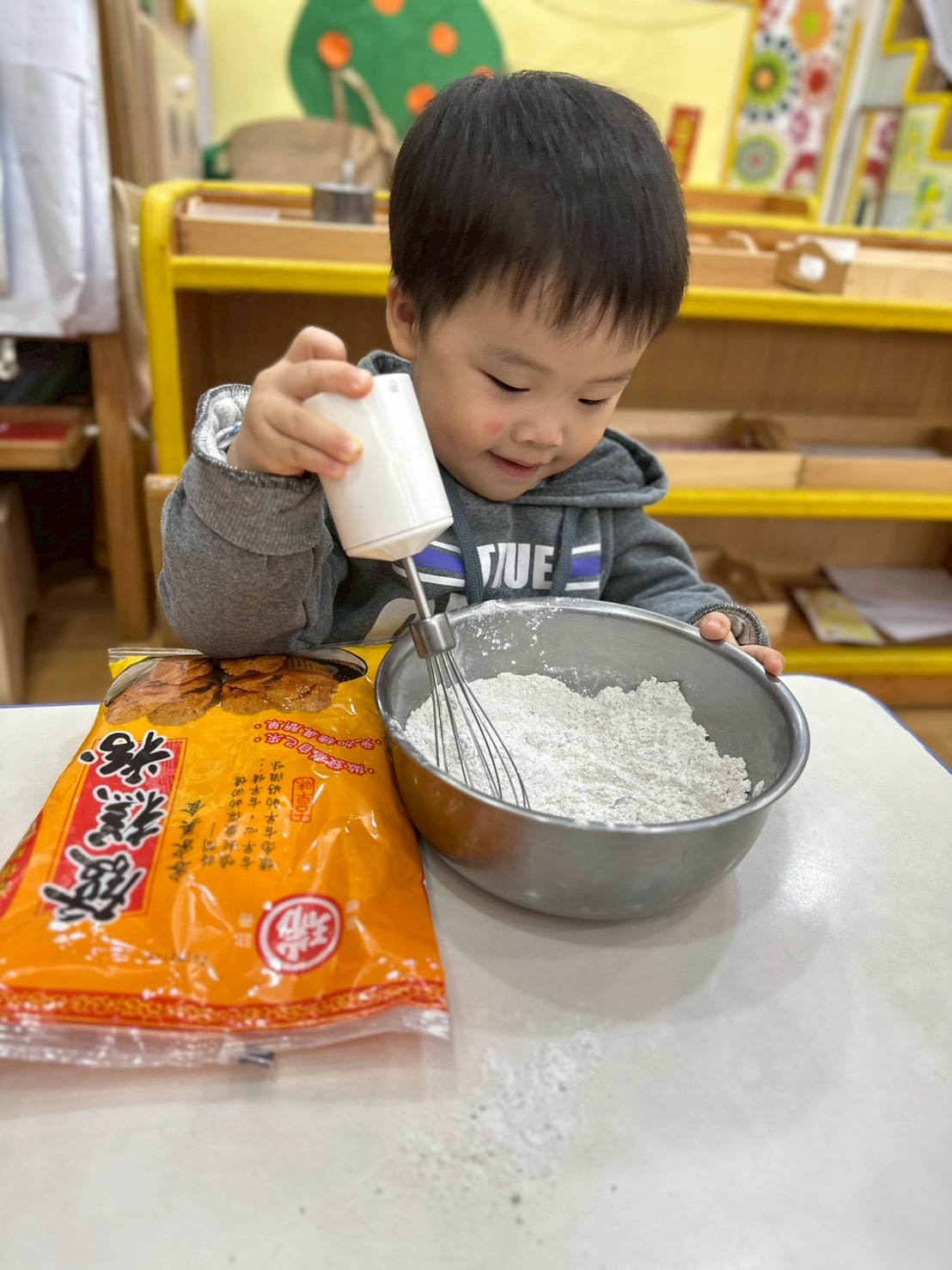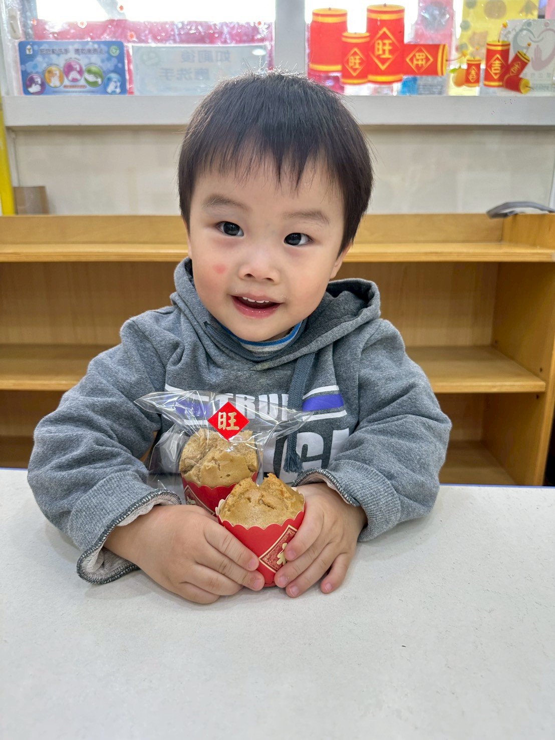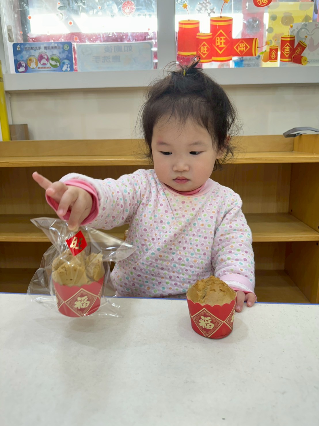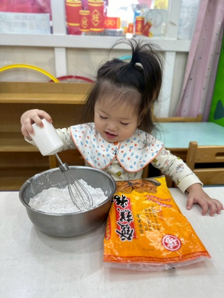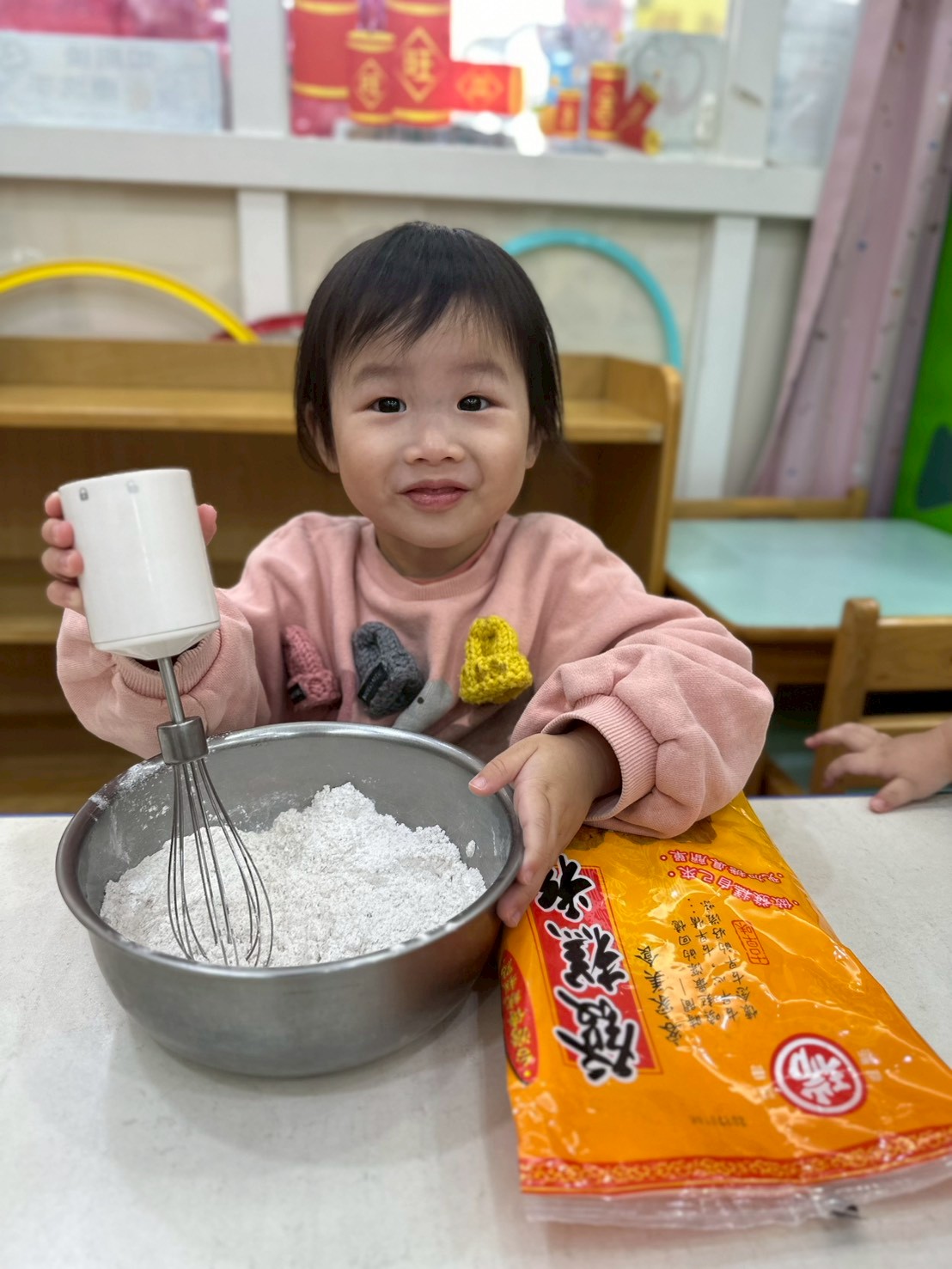 準備迎接過新年啦!!帶寶貝們體驗做發糕的樂趣,動動小手攪拌麵粉,增強手部的小肌肉動作,從中體驗樂趣與認識過年節慶的食物,還可以帶回家和爸爸媽媽一起享用。祝寶貝們:新年快樂~~