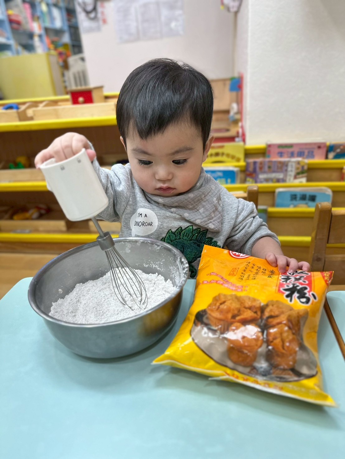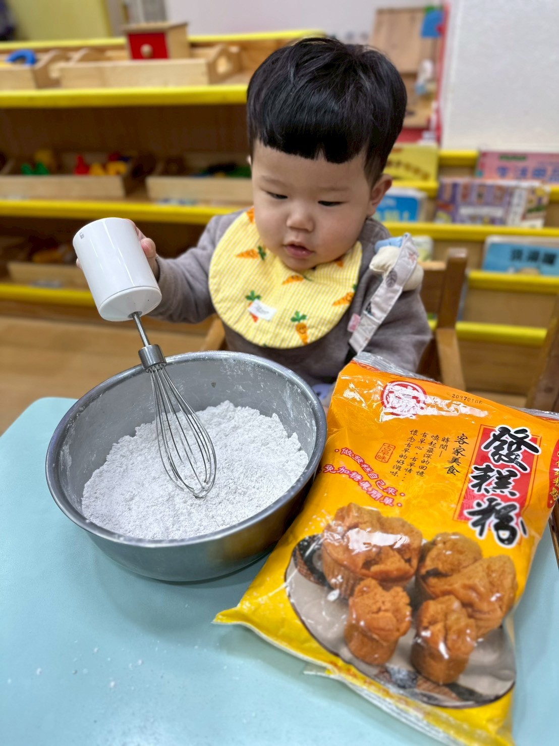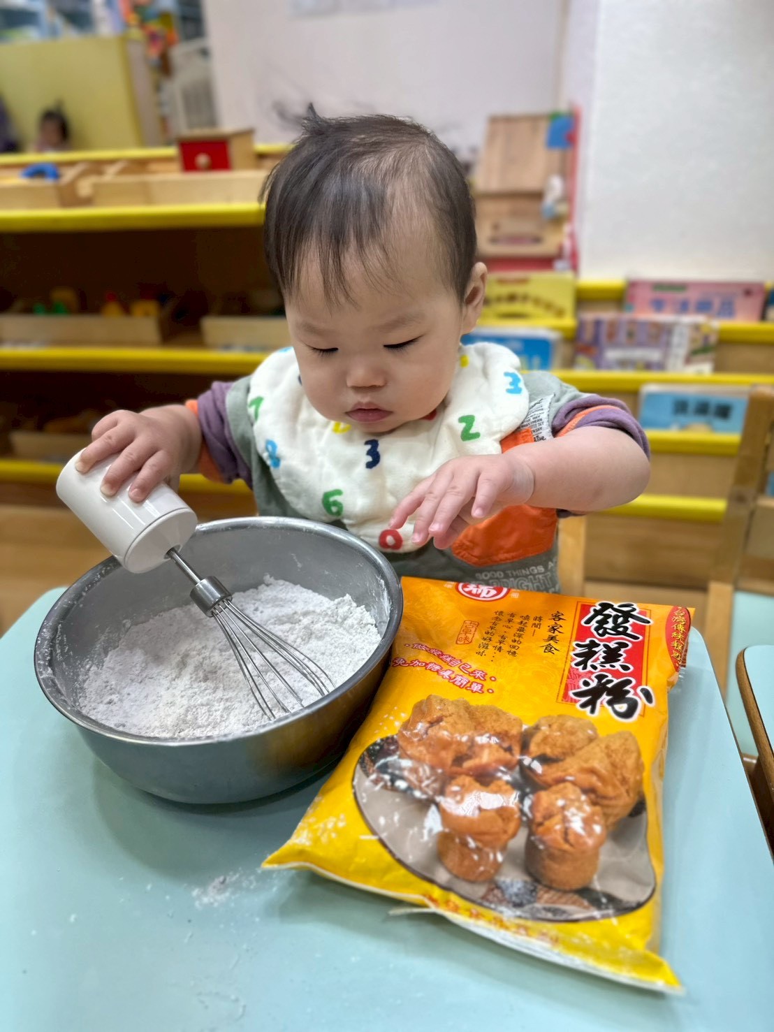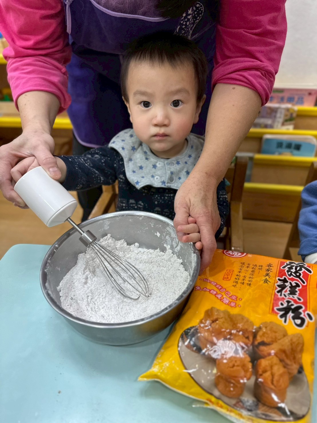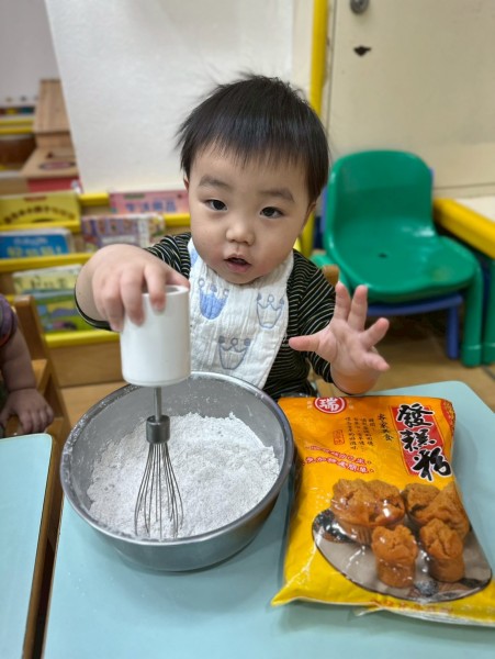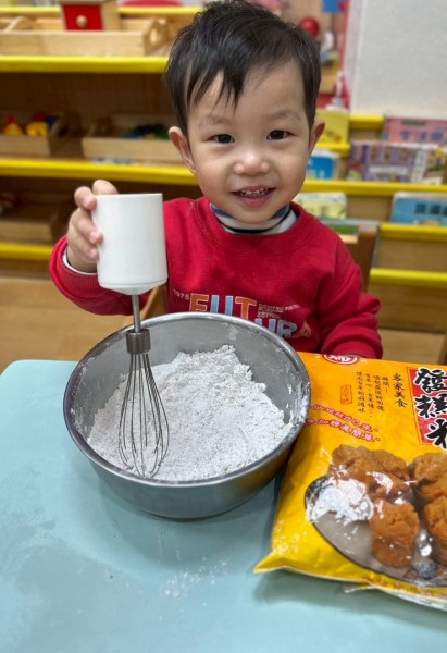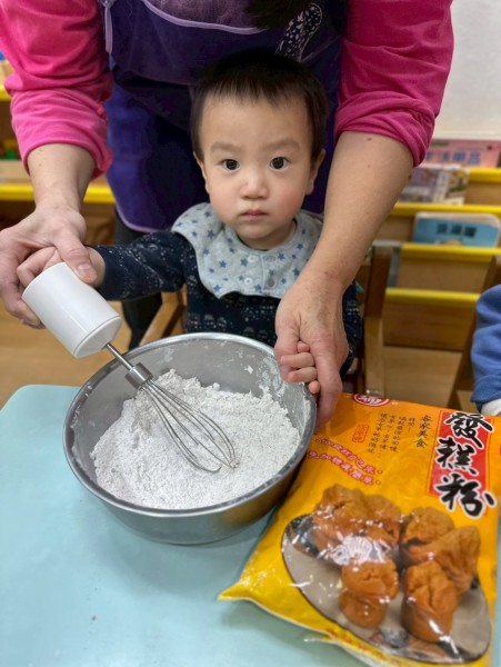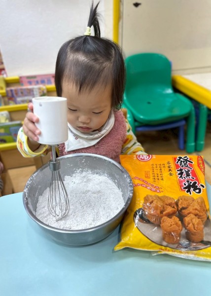 過年快到了,老師準備做發糕的食材有發糕粉、鍋子、攪拌器等教孩子做發糕,讓他們認識過年的食物體驗過年的氣氛。