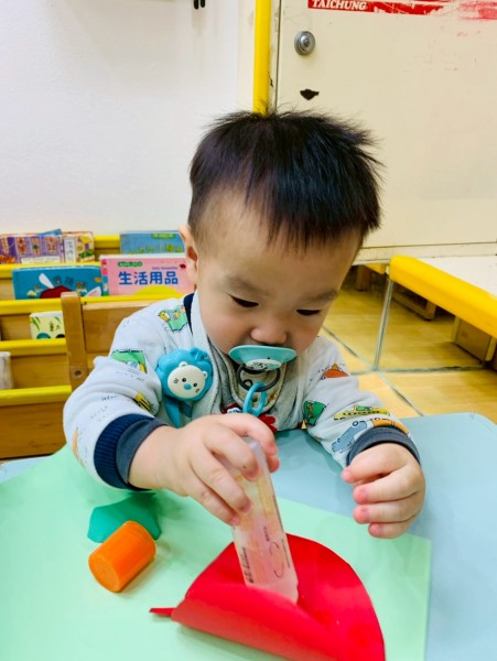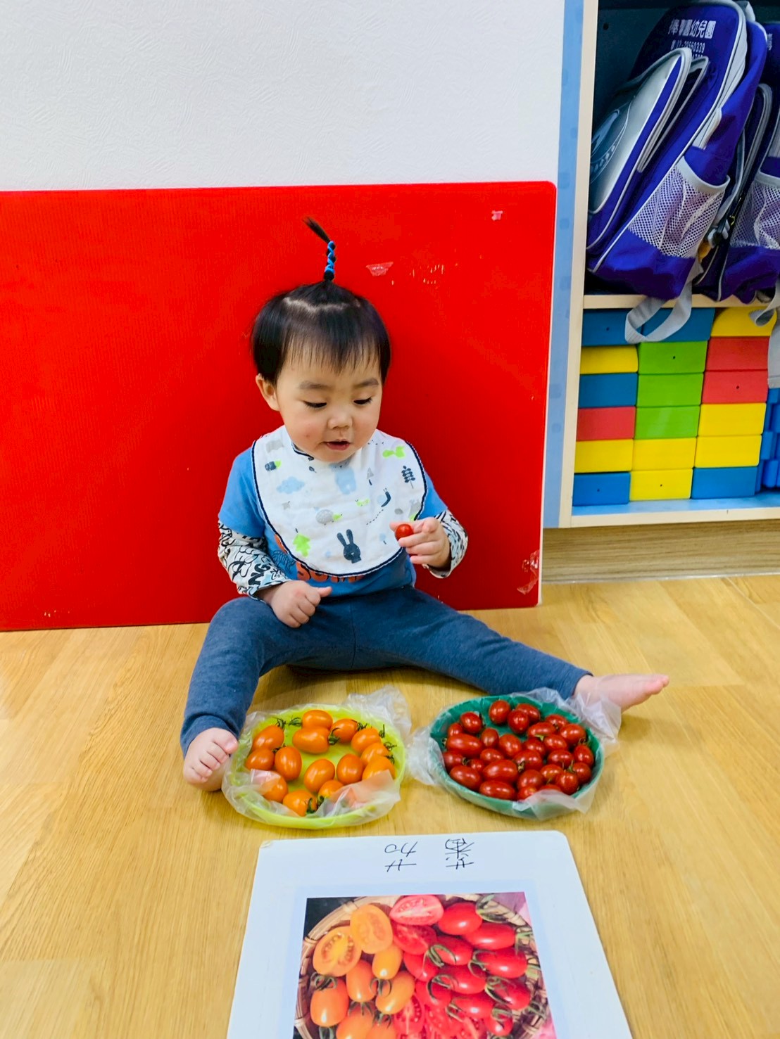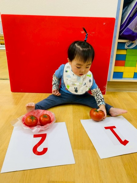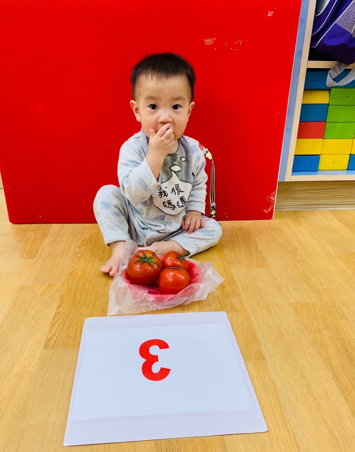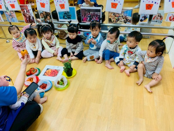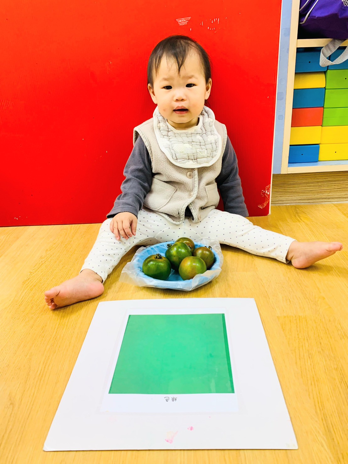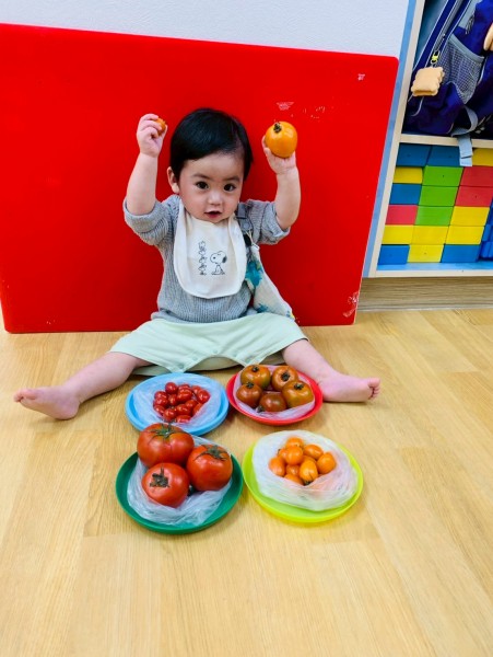 這週課程是上「蕃茄好滋味」設計目的是讓寶貝能充分體驗五感,寶貝們能用視覺認識顏色和形狀,用觸覺感受滑滑的表面,雖然番茄沒有特殊香氣,但寶貝們可以從實物感覺酸甜,再用品嚐蕃茄證實酸甜味道喔,這些感受加在一起,才構成完整的蕃茄味呢!