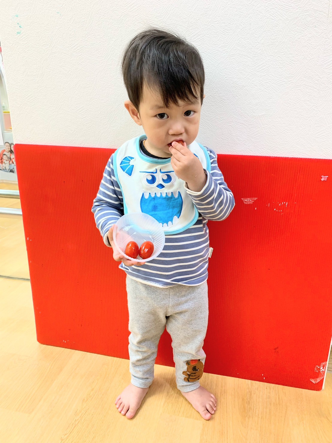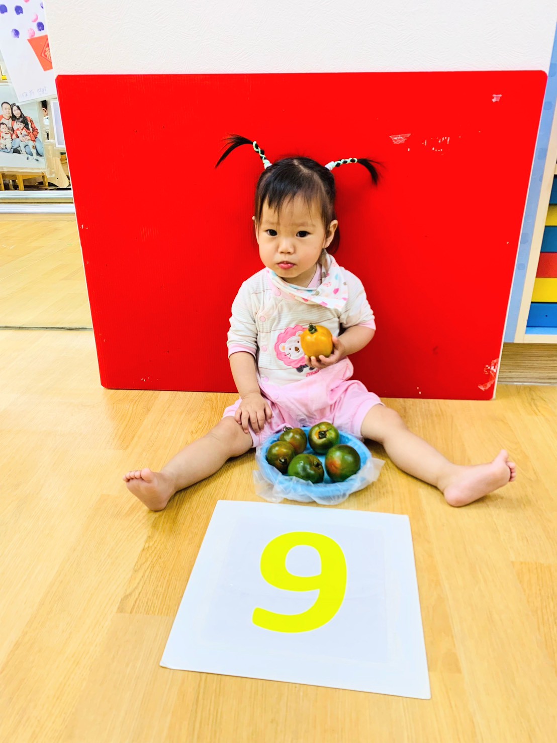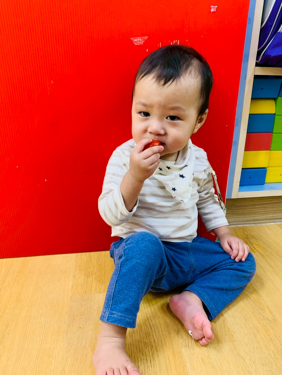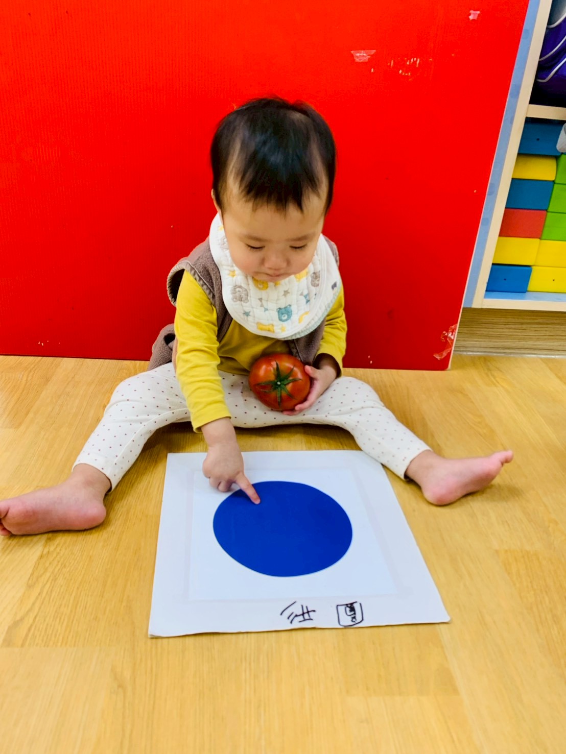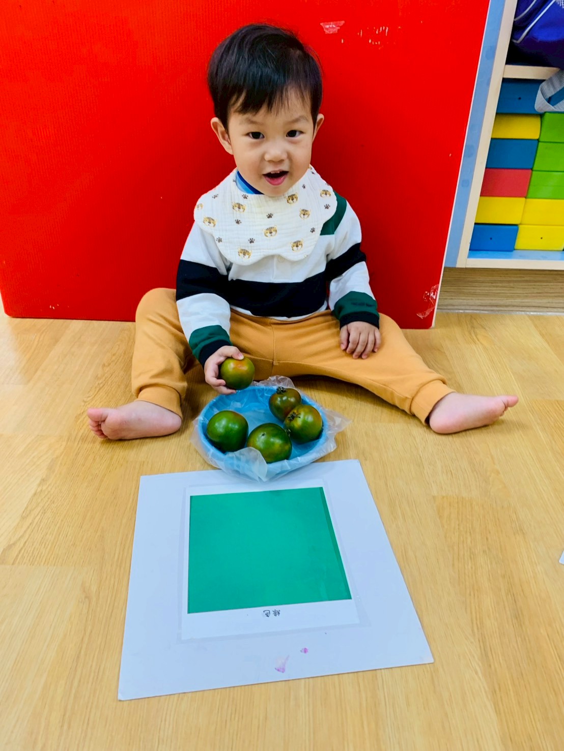 這週課程是上「蕃茄好滋味」設計目的是讓寶貝能充分體驗五感,寶貝們能用視覺認識顏色和形狀,用觸覺感受滑滑的表面,雖然番茄沒有特殊香氣,但寶貝們可以從實物感覺酸甜,再用品嚐蕃茄證實酸甜味道喔,這些感受加在一起,才構成完整的蕃茄味呢!