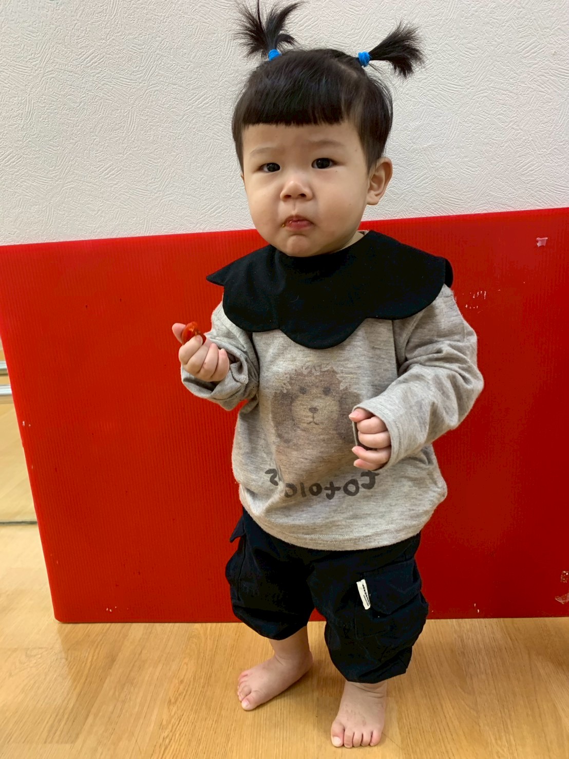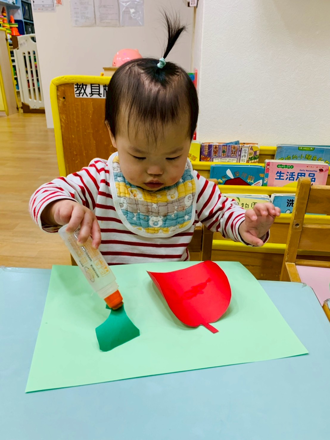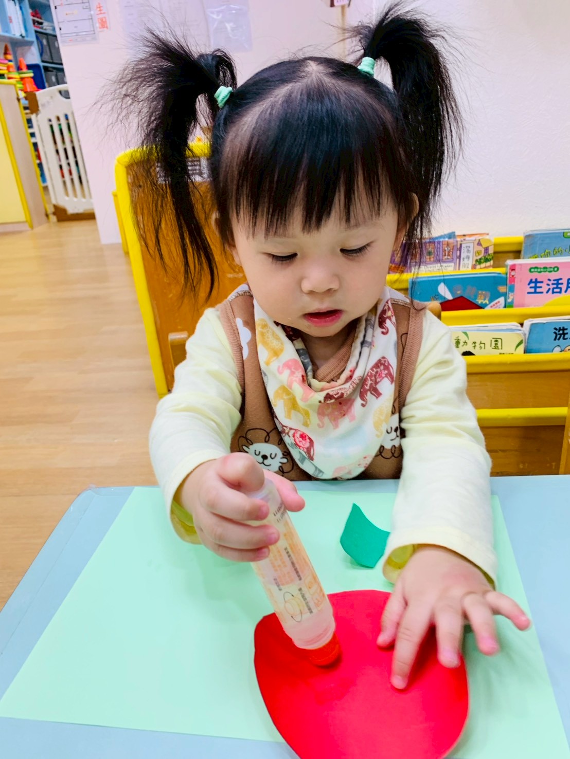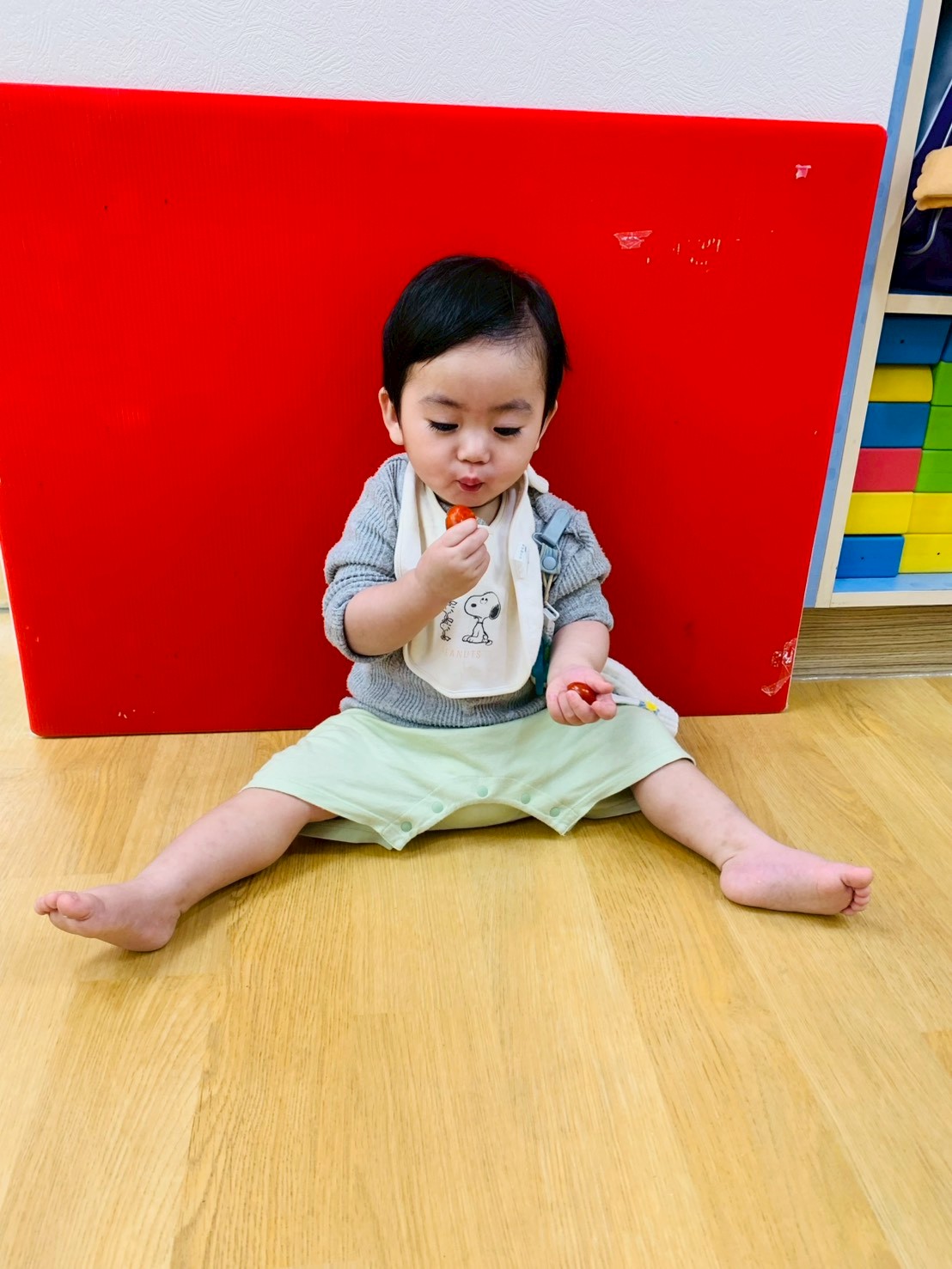 這週課程是上「蕃茄好滋味」設計目的是讓寶貝能充分體驗五感,寶貝們能用視覺認識顏色和形狀,用觸覺感受滑滑的表面,雖然番茄沒有特殊香氣,但寶貝們可以從實物感覺酸甜,再用品嚐蕃茄證實酸甜味道喔,這些感受加在一起,才構成完整的蕃茄味呢!