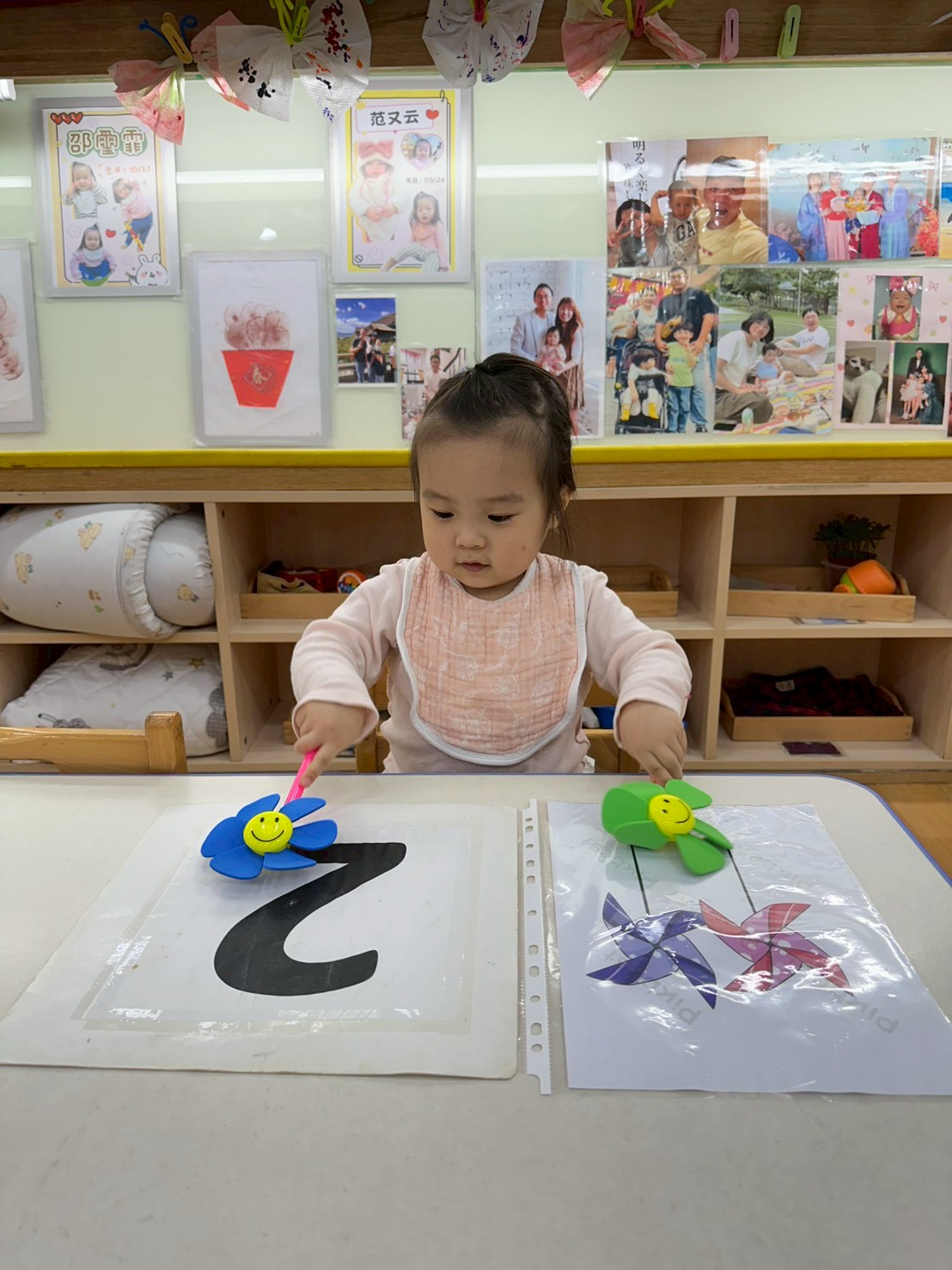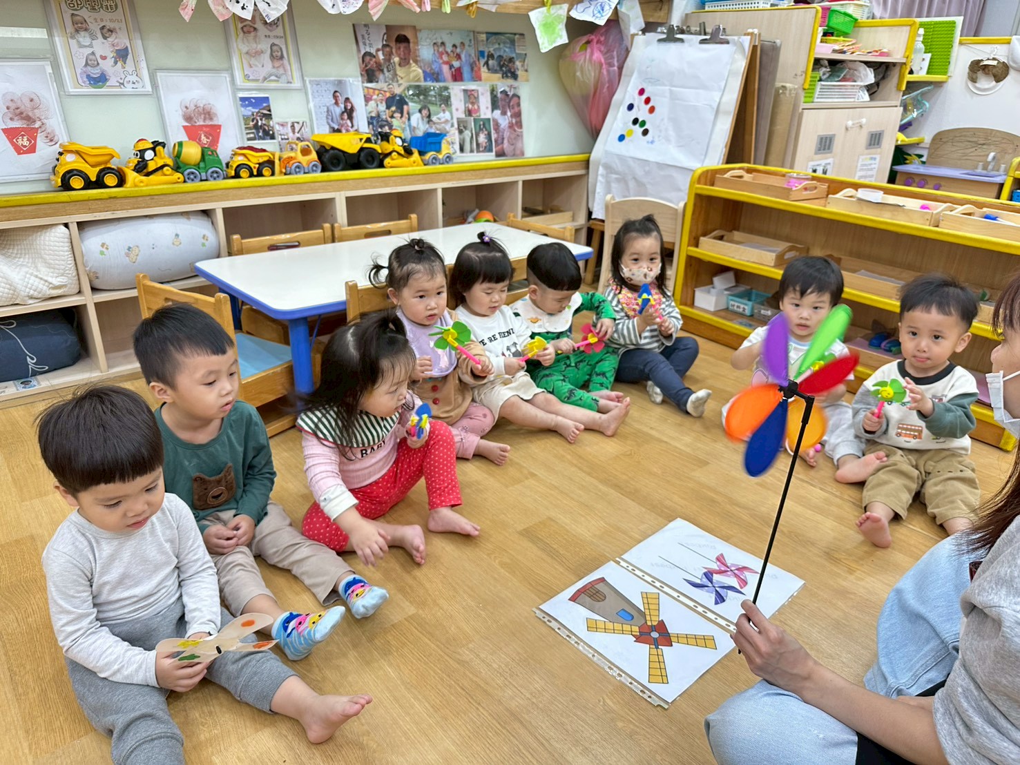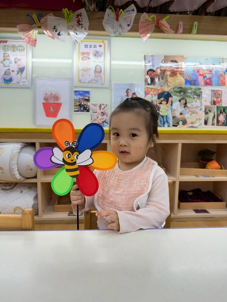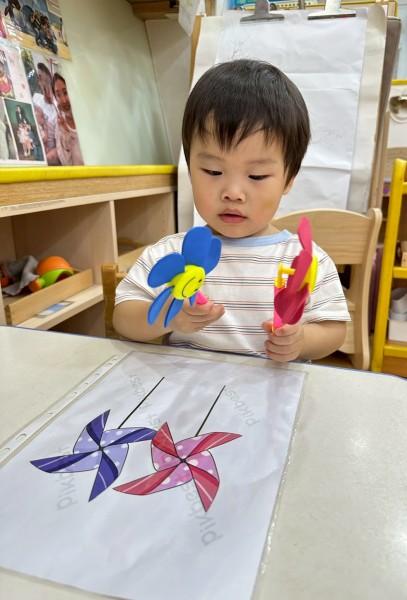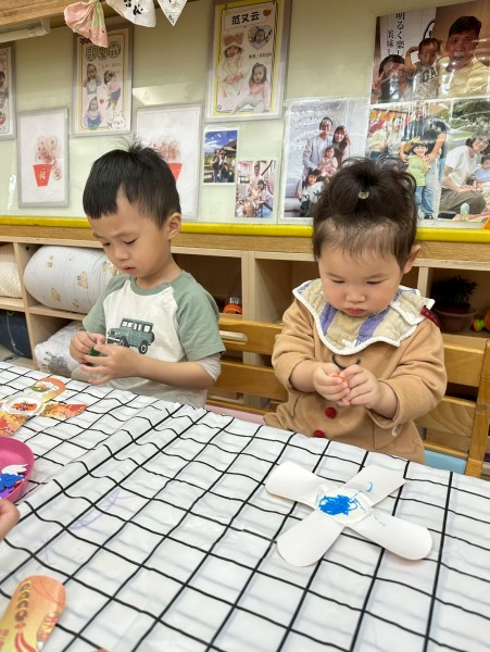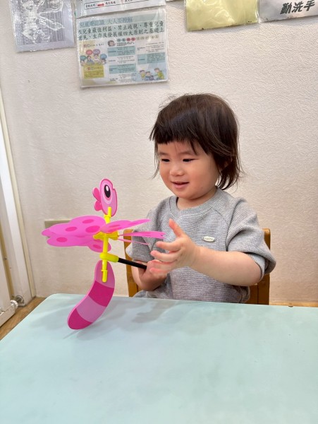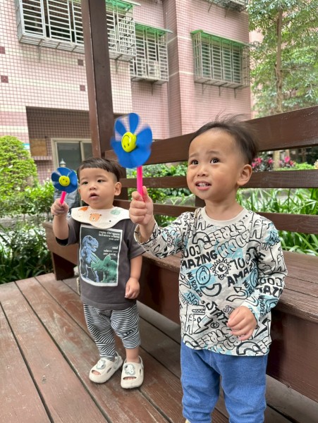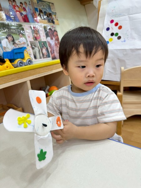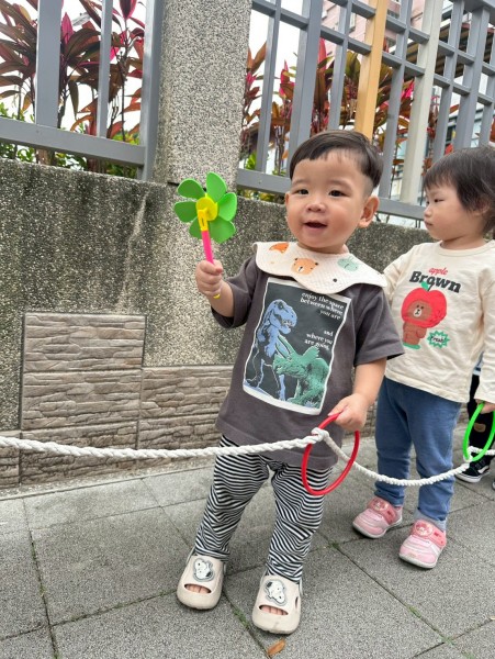 老師準備了各式大小風車,讓寶貝們觀察與遊玩。帶著風車外出散步,在微風中看著風車轉呀轉,孩子們臉上都露出開心笑容。活動中也引導寶貝親手製作風車,貼上喜歡的貼紙,培養創意與手部操作能力,在遊戲中快樂學習與成長。