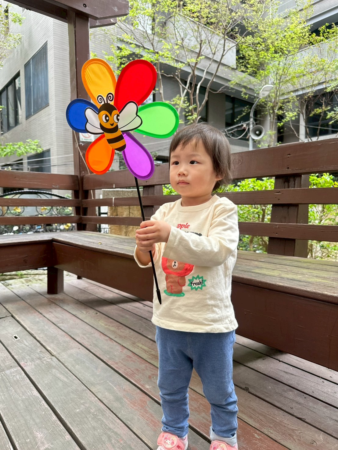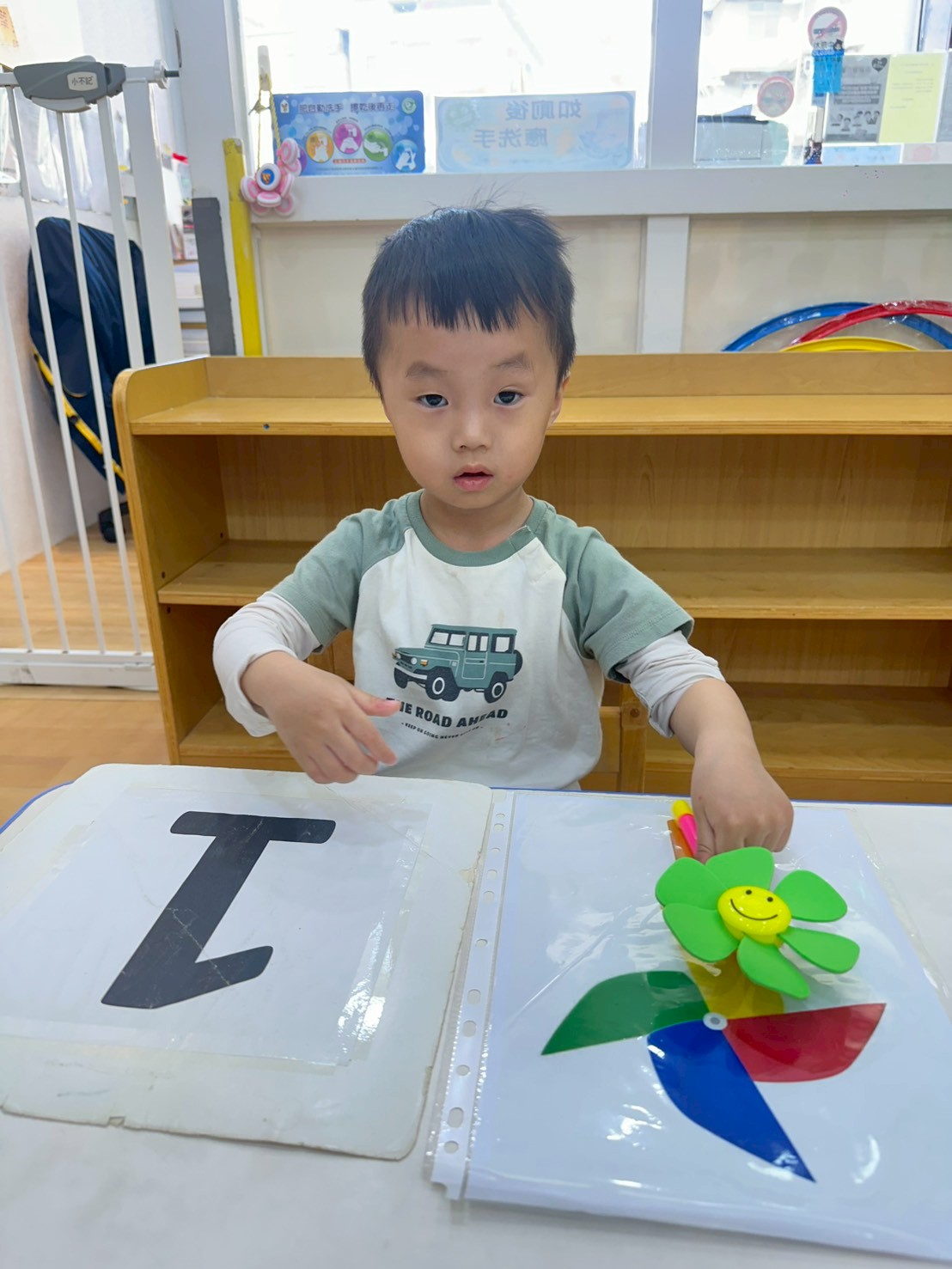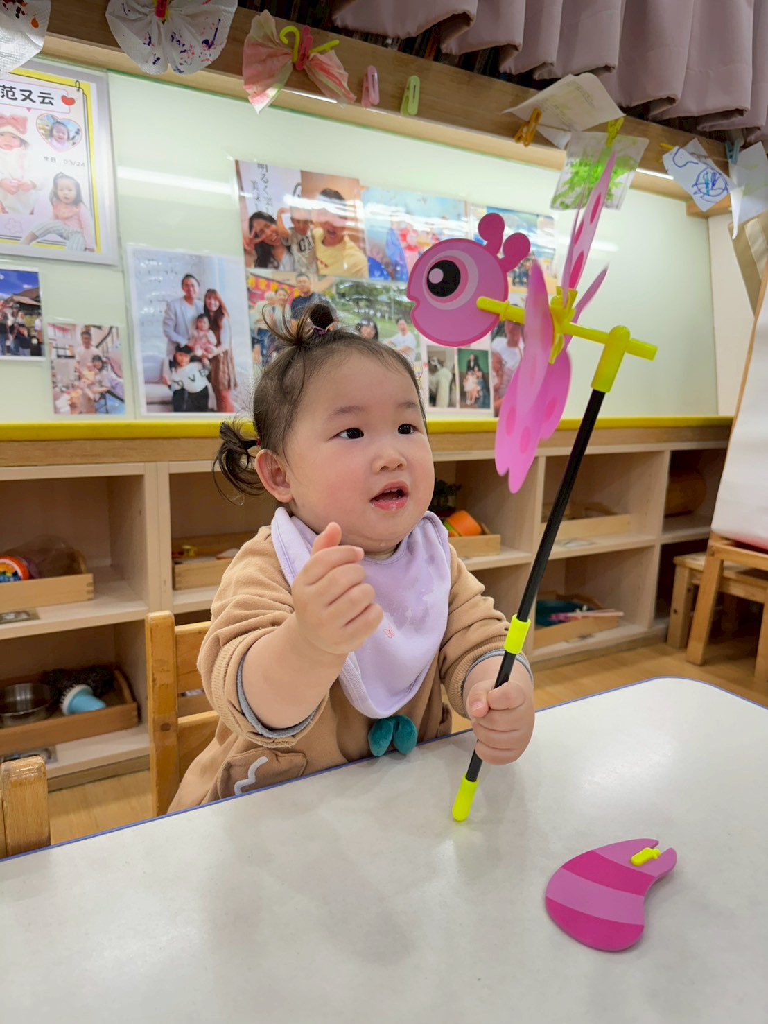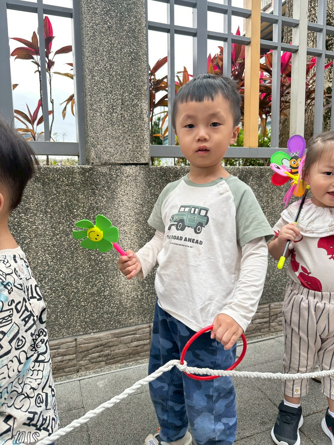 老師準備了各式大小風車,讓寶貝們觀察與遊玩。帶著風車外出散步,在微風中看著風車轉呀轉,孩子們臉上都露出開心笑容。活動中也引導寶貝親手製作風車,貼上喜歡的貼紙,培養創意與手部操作能力,在遊戲中快樂學習與成長。